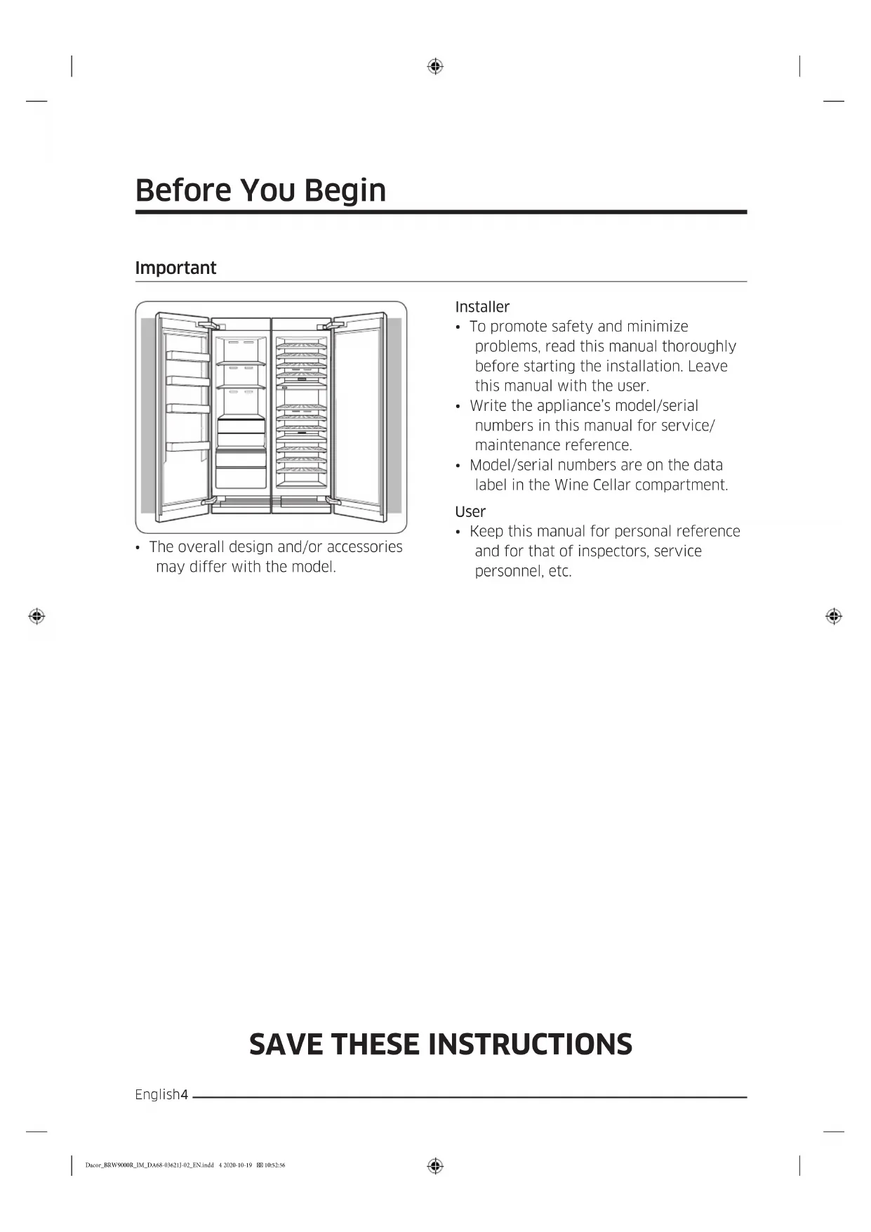 - When you open and close the door, be careful not to put your hands in the doorway. Dacor_BRW9000R_IM_DA68-03621J-02_EN.indd 10 2020-10-19 10:52:57English 11 Safety and Warning Information Installation Safety WARNING
