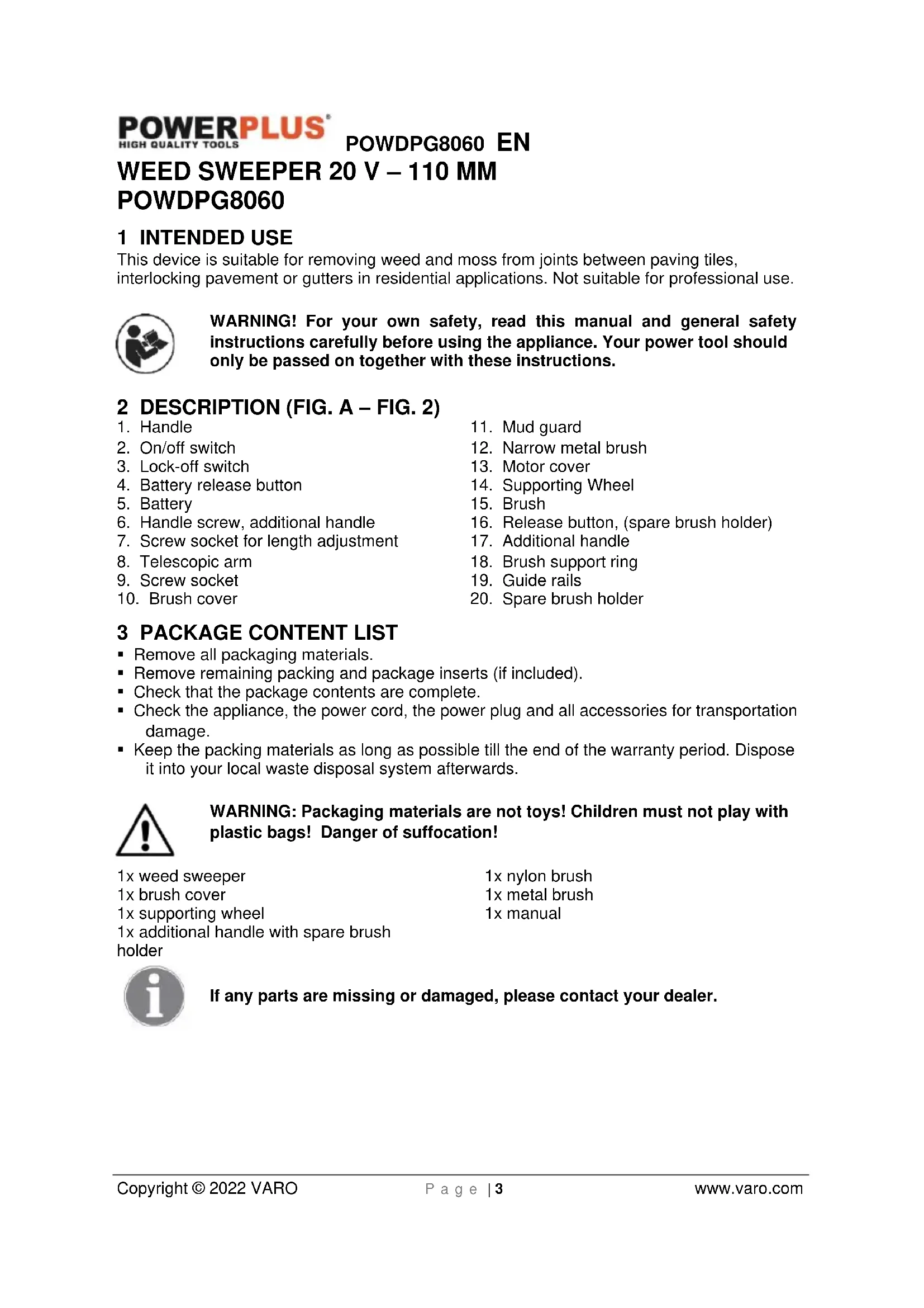 plastic bags! Danger of suffocation! 1x weed sweeper 1x brush cover 1x supporting wheel 1x additional handle with spare brush holder 1x nylon brush 1x metal brush 1x manual If any parts are missing or damaged, please contact your dealer.POWDPG8060 EN Copyright © 2022 VARO P a g e | 4 www.varo.com 4 SYMBOLS In this manual and/or on the machine the following symbols are used: