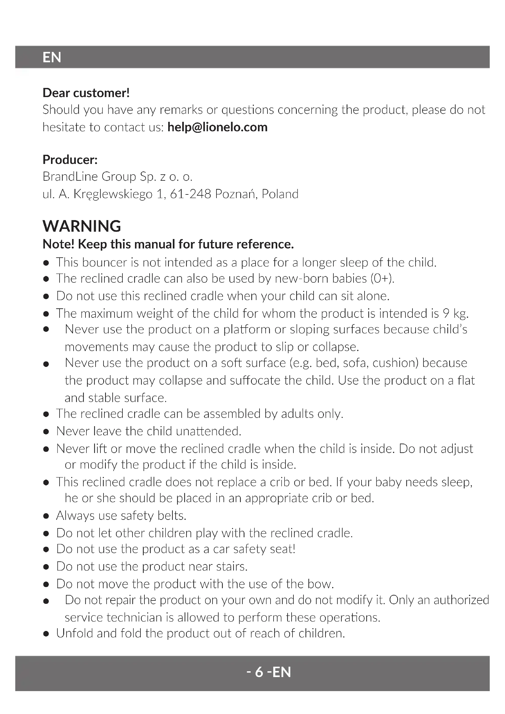 Detach the protecve buckles at the back of the covering. Loosen safety belts of the product. Use a longitudinal item to press the clip located at the boom of the module. Detach the frame of the product and remove the covering. How to clean and maintain Wash the upholstery manually at the temperature of up to 30 °C with the use of a so detergent (e.g. soap). Do not bleach the upholstery, do not dry it mechanically or iron. Clean the frame, bow and toys with a wet cloth immersed in a so detergent. It is forbidden to bleach or use causc cleaning agents. It is forbidden to immerse these elements in water. The pictures are for reference only. The real design of the products may dier from the pictures presented. The product complies with requirements of EU direcves. Pursuant to the Direcve 2012/19/EU, this product is subject to selecve collecon. The product must not be disposed of along with domesc waste as it may pose a threat to the environment and human health. The worn- out product must be handed over to the electrics and electronics recycling center.‑ 11 ‑ PL Drogi Kliencie! Jeśli masz jakiekolwiek uwagi lub pytania do zakupionego produktu, skontaktuj się z nami: help@lionelo.com Producent: BrandLine Group Sp. z o. o. ul. A. Kręglewskiego 1, 61-248 Poznań, Polska OSTRZEŻENIE