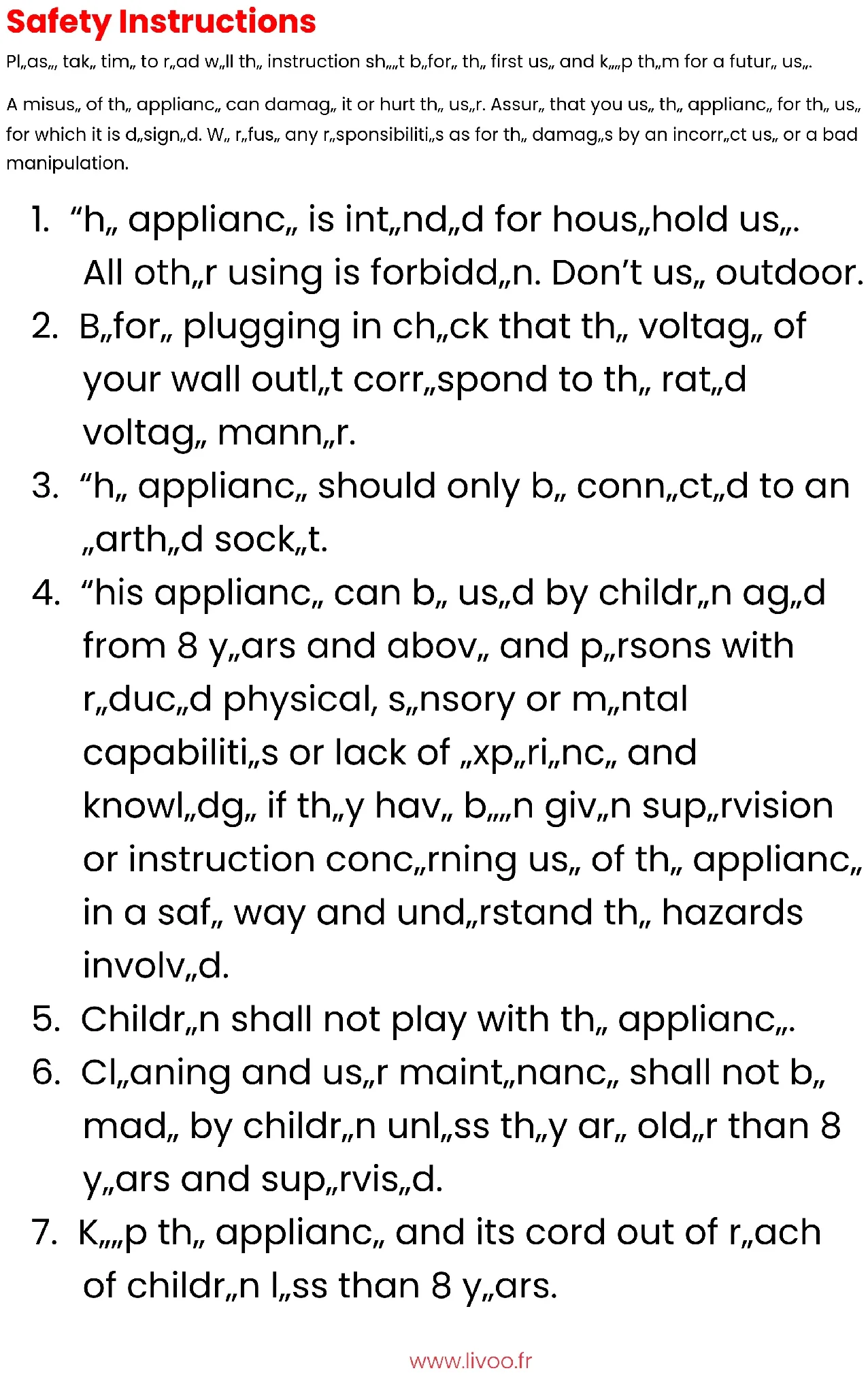 @Livoo ENwww.livoo.fr Safety Instructions Please, take time to read well the instruction sheet before the first use and keep them for a future use. A misuse of the appliance can damage it or hurt the user. Assure that you use the appliance for the use for which it is designed. We refuse any responsibilities as for the damages by an incorrect use or a bad manipulation.