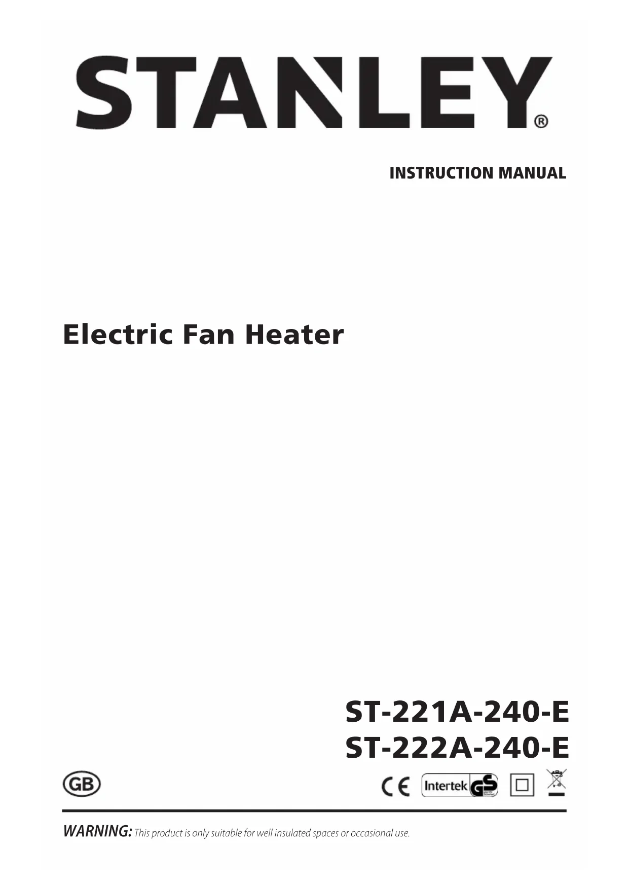 Download the instructions for your Heating in PDF format for free! Find your manual ST222A240E - STANLEY and take your electronic device back in hand. On this page are published all the documents necessary for the use of your device. ST222A240E by STANLEY.