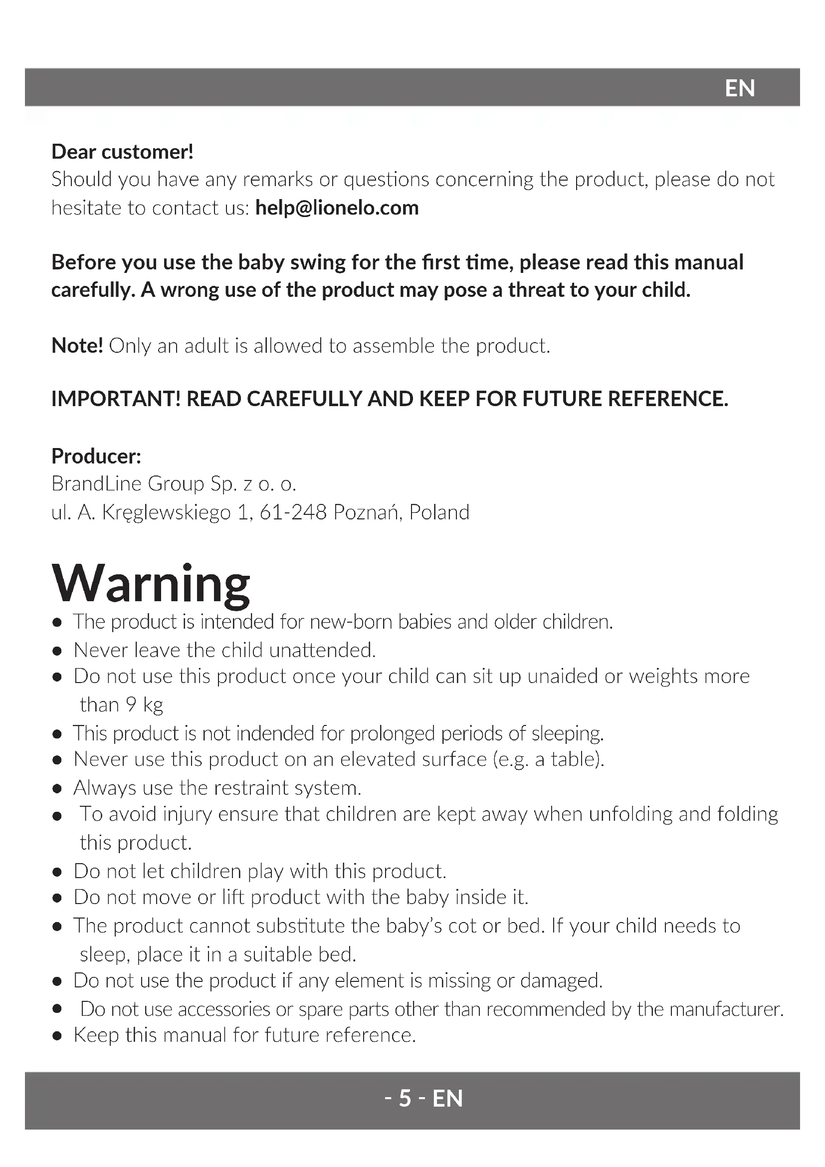 Secure the product with an assembly belt located at the reverse of the covering (see: g. 15) Troubleshoong Problem Possible cause Soluon Addional informaon Light indicator ashes Low baeries or damage to feeder cable. Replace baery or adapter. Rocking stops suddenly. Set me has passed. Deacvate rocking with a knob and then acvate it again. Disable rocking me seng. Each of these soluons will cause the product to resume working, only the following will change: work me and rocking speed. Rocking does not start Baeries have been inserted in a wrong way. Damage to the feeder cable. Feeder cable has been connected in a wrong way. No power supply in the socket. Insert the baeries again. Pay special aenon to marking (poles). Check the feeder cable and wire for proper connecon. Check if the feeder cable has been plugged in the socket properly. The angle of rocking is lower than desired. The baby swing needs about 20-45 seconds to rock properly. At low voltage and high load, the baby swing may need up to 50 seconds to start rocking properly. Distorted music. Flat baeries. Replace the baeries.‑ 10 ‑EN | PL Music stops play- ing suddenly. Set me has passed. Press the music play key again. The rocking me and music playing me sengs do not correlate. You can adjust the sengs so that the music stops playing when the product keeps on rocking the child or the other way round. Such operaon is intenonal and is to give the user more freedom in changing sengs. How to clean and maintain The cushion, seat covering - wash manually at the temperature of max. 40°C. The bow and frames - wash with a wet and so cloth with a so detergent. Wipe it dry aerwards. The pictures are for reference only. The real design of the products may dier from the pictures presented. Drogi Kliencie! Jeśli masz jakiekolwiek uwagi lub pytania do zakupionego produktu, skontaktuj się z nami: help@lionelo.com Przed pierwszym użyciem leżaczka prosimy o uważne przeczytanie niniejszej instrukcji użytkowania. Nieprawidłowe używanie produktu może stanowić zagrożenie dla dziecka. Uwaga! Montaż musi być przeprowadzony przez osobę dorosłą. WAŻNE! PRZECZYTAJ UWAŻNIE I ZACHOWAJ NA PRZYSZŁOŚĆ JAKO ODNIESIENIE. PL‑ 11 ‑ PL Producent: BrandLine Group Sp. z o. o. ul. A. Kręglewskiego 1, 61-248 Poznań, Polska Ostrzeżenie