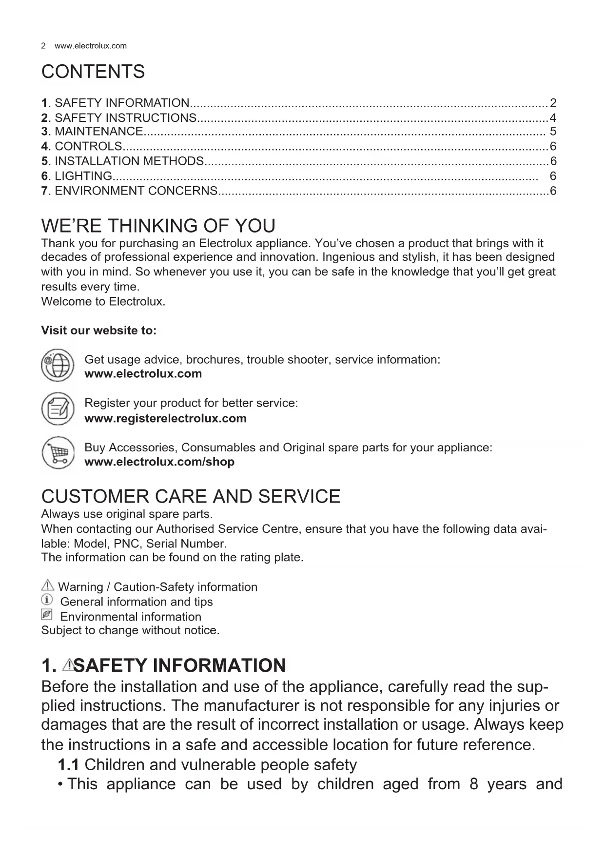 Thank you for purchasing an Electrolux appliance. You’ve chosen a product that brings with it decades of professional experience and innovation. Ingenious and stylish, it has been designed with you in mind. So whenever you use it, you can be safe in the knowledge that you’ll get great results every time. Welcome to Electrolux. Visit our website to: Get usage advice, brochures, trouble shooter, service information: www.electrolux.com Register your product for better service: www.registerelectrolux.com Buy Accessories, Consumables and Original spare parts for your appliance: www.electrolux.com/shop