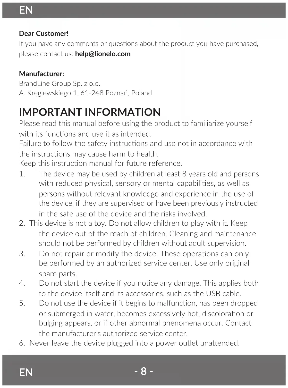 Dear Customer! If you have any comments or quesons about the product you have purchased, please contact us: help@lionelo.com Manufacturer: BrandLine Group Sp. z o.o. A. Kręglewskiego 1, 61-248 Poznań, Poland IMPORTANT INFORMATION Please read this manual before using the product to familiarize yourself with its funcons and use it as intended. Failure to follow the safety instrucons and use not in accordance with the instrucons may cause harm to health. Keep this instrucon manual for future reference.