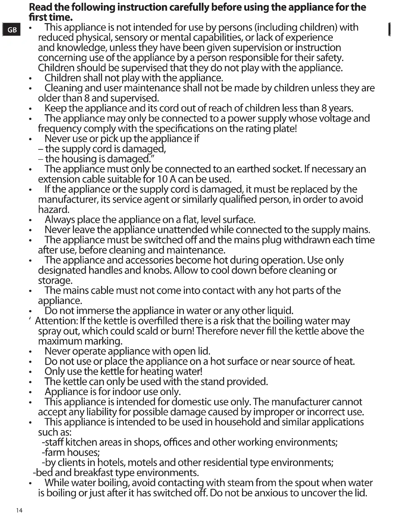 - Donotimmersetheapplianceinwateroranyotherliquid. ‘ Attention: If the kettle is overlled there is a risk that the boiling water may spray out, which could scald or burn! Therefore never ll the kettle above the maximum marking.