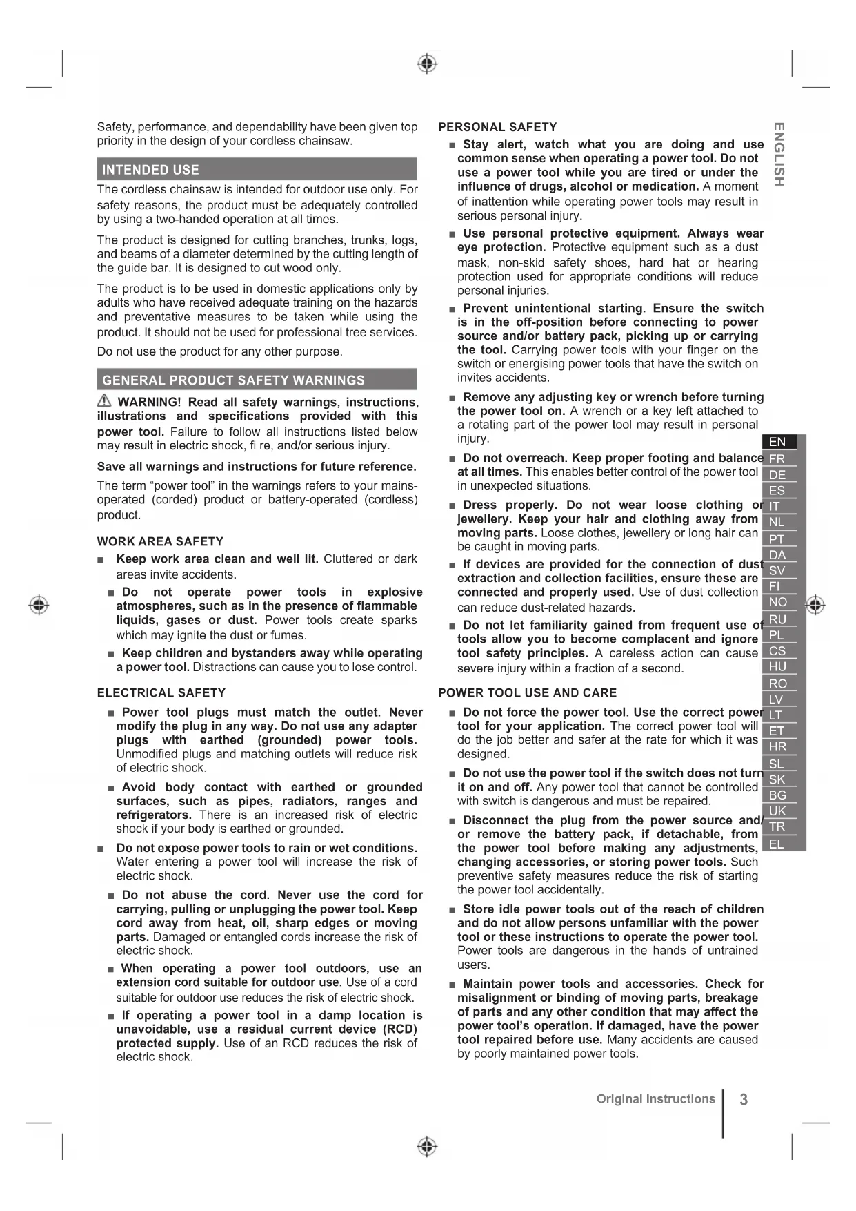 Original Instructions Safety, performance, and dependability have been given top priority in the design of your cordless chainsaw. INTENDED USE The cordless chainsaw is intended for outdoor use only. For safety reasons, the product must be adequately controlled by using a two-handed operation at all times. The product is designed for cutting branches, trunks, logs, and beams of a diameter determined by the cutting length of the guide bar. It is designed to cut wood only. The product is to be used in domestic applications only by adults who have received adequate training on the hazards and preventative measures to be taken while using the product. It should not be used for professional tree services. Do not use the product for any other purpose.