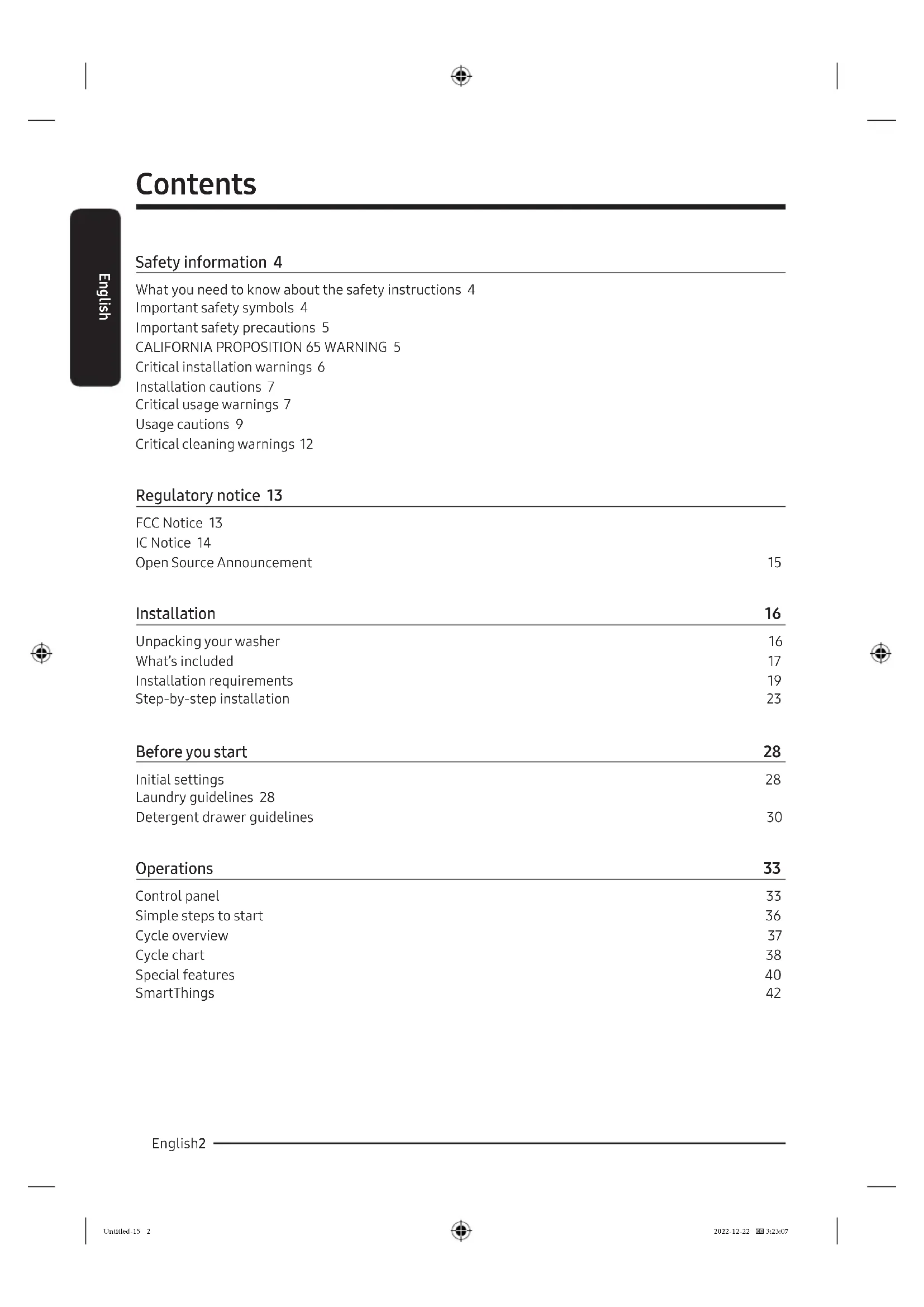 Critical installation warnings 6 Installation cautions 7 Critical usage warnings 7 Usage cautions 9 Critical cleaning warnings 12 Regulatory notice 13 FCC Notice 13 IC Notice 14 Open Source Announcement 15 Installation 16 Unpacking your washer 16 What’s included 17 Installation requirements 19 Step-by-step installation 23 Before you start 28 Initial settings 28 Laundry guidelines 28 Detergent drawer guidelines 30 Operations 33 Control panel 33 Simple steps to start 36 Cycle overview 37 Cycle chart 38 Special features 40 SmartThings 42 Untitled-15 2 2022-12-22 3:23:07English English 3 Maintenance 43 SELF CLEAN 43 Smart Care 44 Emergency drain 44 Cleaning 45 Recovery from freezing 49 Care for an extended period of non-use 49 Cleaning the exterior 49 Cleaning the interior 50 Troubleshooting 51 Checkpoints 51 Information codes 55 Specifications 57 Fabric care chart 57 Protecting the environment 58 Declaration of conformity 58 Specification sheet 59 Untitled-15 3 2022-12-22 3:23:07English