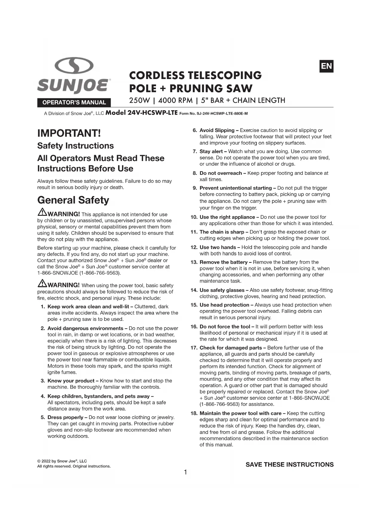 24VHCSWPLTE - Saw Sun Joe - Free user manual and instructions
