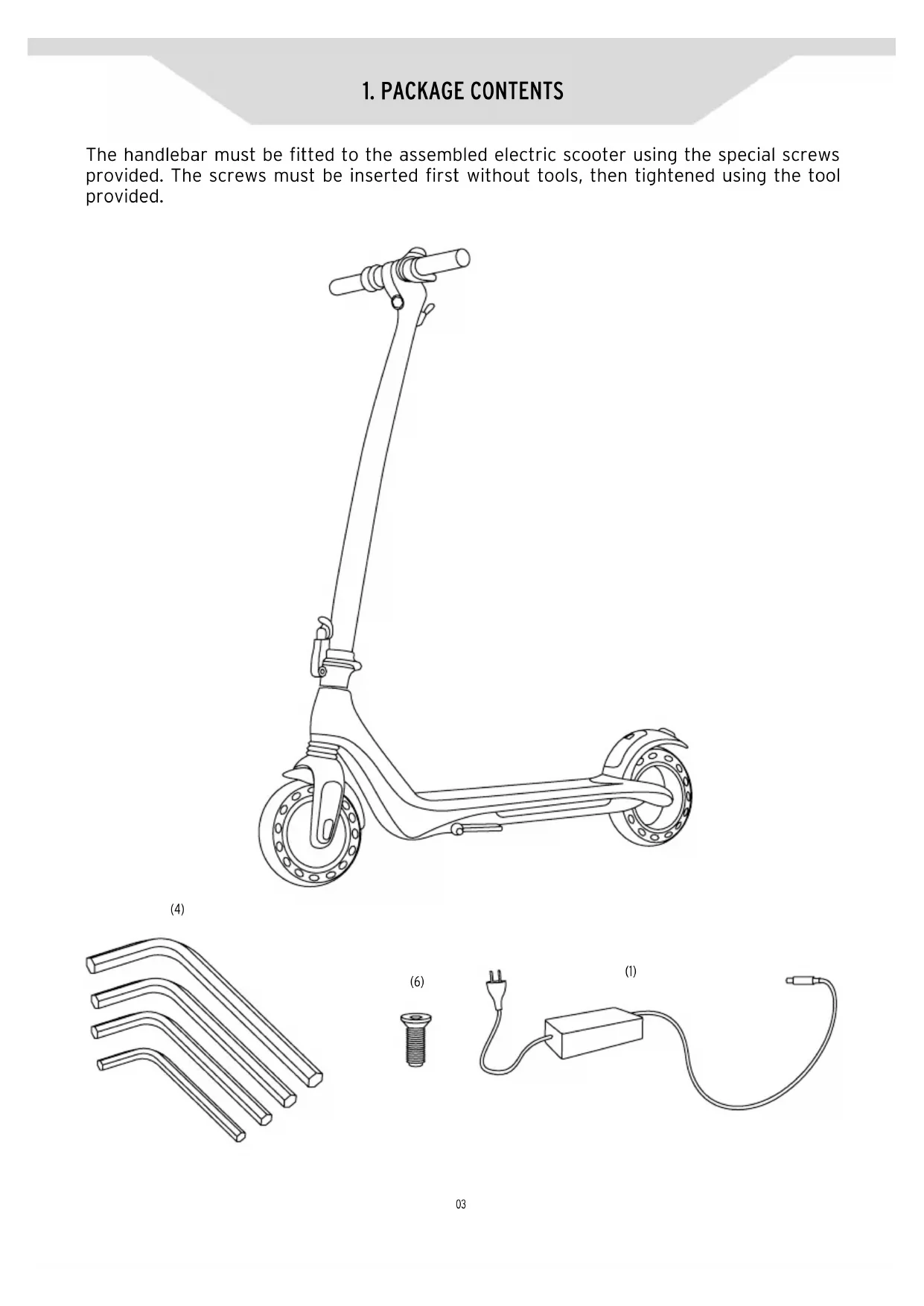 The handlebar must be fitted to the assembled electric scooter using the special screws provided. The screws must be inserted first without tools, then tightened using the tool provided. (4) (6) (1)04