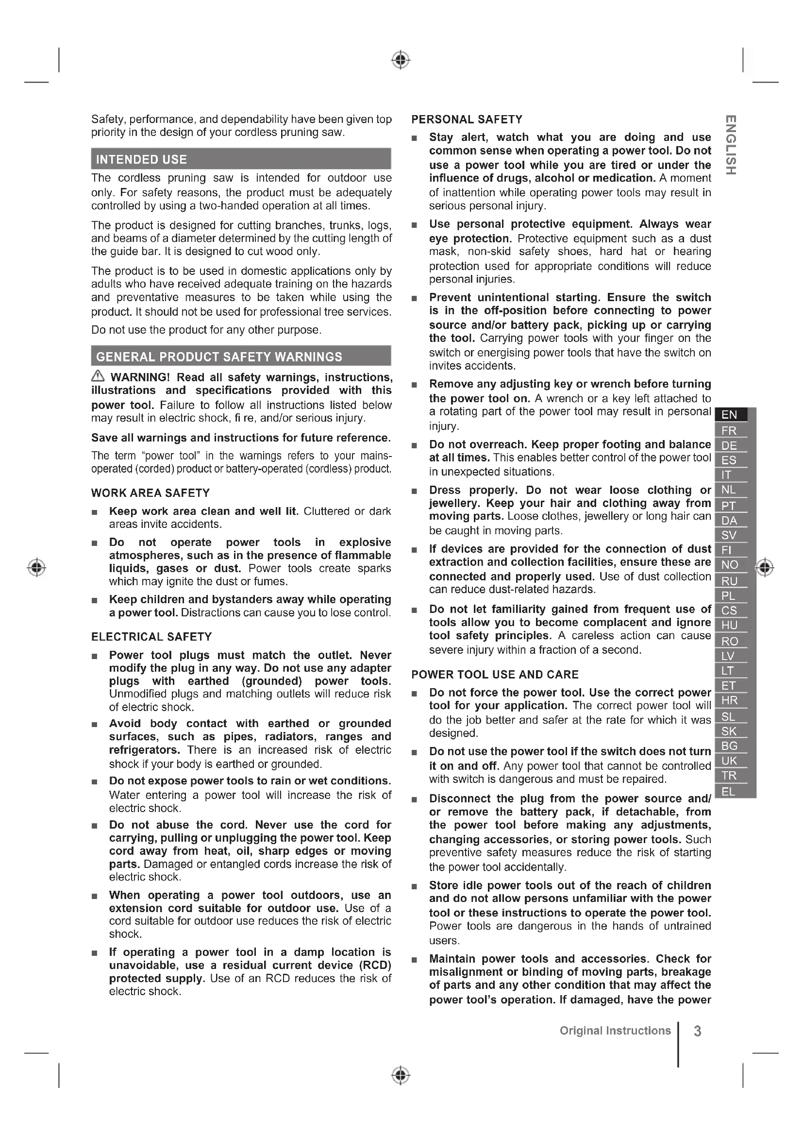 Original Instructions Safety, performance, and dependability have been given top priority in the design of your cordless pruning saw. INTENDED USE The cordless pruning saw is intended for outdoor use only. For safety reasons, the product must be adequately controlled by using a two-handed operation at all times. The product is designed for cutting branches, trunks, logs, and beams of a diameter determined by the cutting length of the guide bar. It is designed to cut wood only. The product is to be used in domestic applications only by adults who have received adequate training on the hazards and preventative measures to be taken while using the product. It should not be used for professional tree services. Do not use the product for any other purpose.