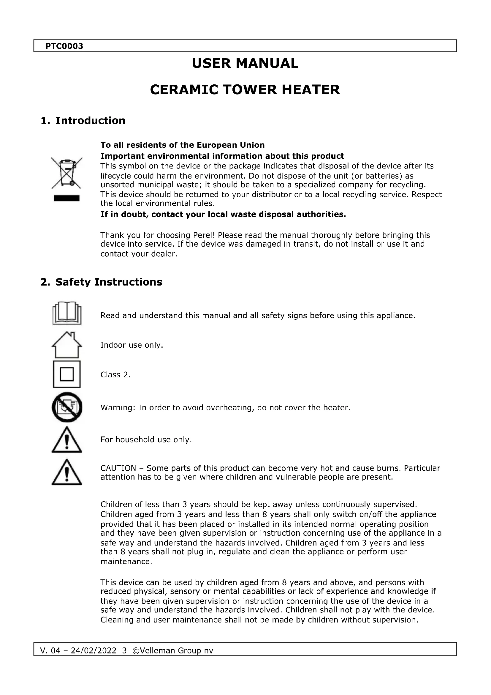 Download the instructions for your Heating in PDF format for free! Find your manual PTC0003 - Perel and take your electronic device back in hand. On this page are published all the documents necessary for the use of your device. PTC0003 by Perel.