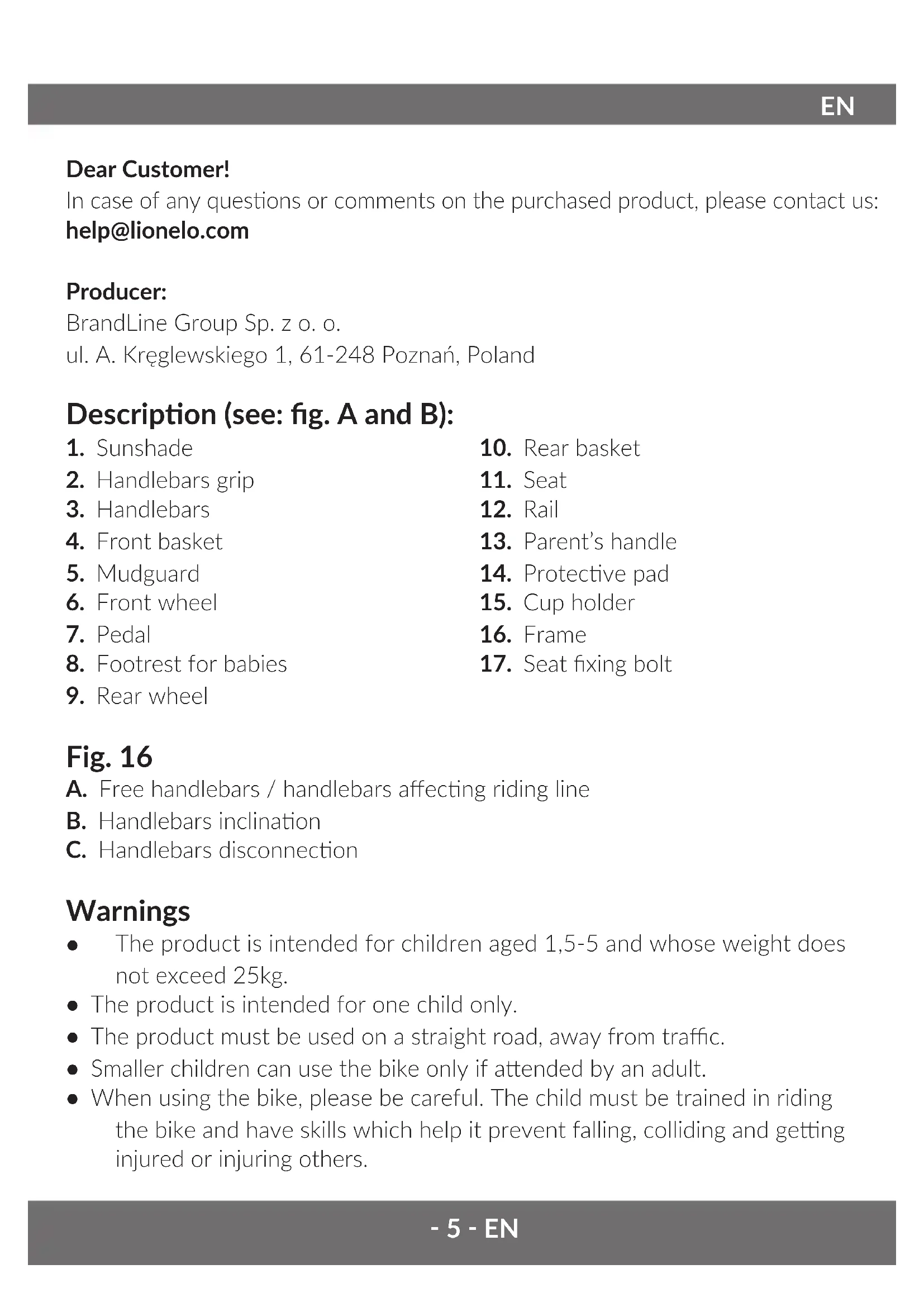 J. Fix the cup holder on the parent’s handle (g. 15). How to use Sit on the seat, fasten safety belts, grab both handlebars grips, and then start pedaling to set the bike in moon. To turn, turn the handlebars in a desired direcon. To brake, stop pedaling. How to adjust How to lock pedals – free wheel funcon The three-wheeled bike has a free wheel funcon. When using this funcon, the child can pedal regardless of the speed of the bike. To set this conguraon, switch the lever on the side of the wheel. If you want the movement of pedals to lead to movement of wheel, switch this lever again. If your child uses a tricycle alone, make sure that the freewheel funcon is disabled. How to lock handlebars To lock handlebars, press the buon showed in g. 16. The locked buon will unite the handlebars with the wheel. If you slide it in another direcon, it will be unlocked and the child will be allowed to play with the handlebars, without any impact on riding line. It is also possible to incline the handlebars (see: How to adjust the seat backrest). Independent bike The product can also be used without the parent’s handle in the independent bike funcon. To disassemble: incline the lever located at the boom of the handle and slide the element out. Secure the metal shank standing out of the bike crossbar with the protecve pad (marked as 14 in g. B). How to adjust the seat backrest To set the backrest in one of three available posions, use the buckle at the back of the backrest. If you can hear a „click”, it means the backrest has been properly locked. There are three rear-facing and forward-facing backrest posions. The backrest can also be forward-folded for transportaon purposes. When changing the seat backrest angle in a rear-facing posion, at rst fold the‑ 8 ‑EN handlebars. To do so, press the buon marked as B in g. 16 and incline the handlebars. How to adjust the seat front-back ATo adjust the posion, loosen the bolt located at the boom of the seat. Aer seng the desired posion, ghten the bolt up again. To adjust the height of the handle Adjust the height of the handle by pressing the interlock located at the top of the handle. A 3-level adjustment is possible. How to lock rear wheels To lock rear wheels, press both brakes with a foot. How to disassemble and transport In order to fold the product:
