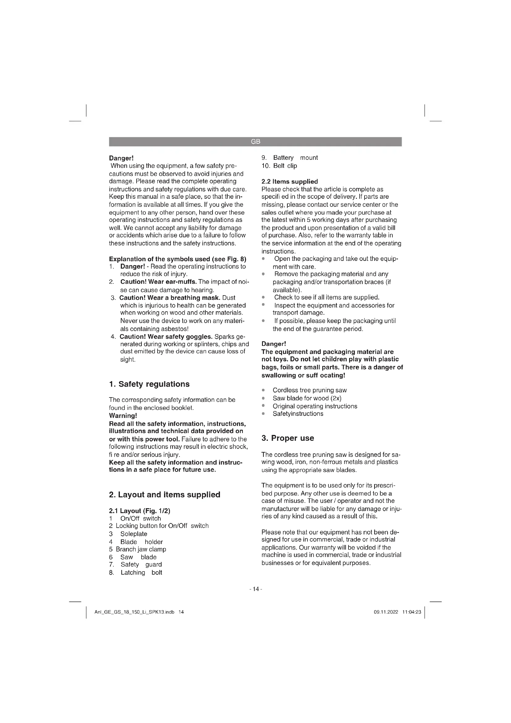 The cordless tree pruning saw is designed for sa- wing wood, iron, non-ferrous metals and plastics using the appropriate saw blades. The equipment is to be used only for its prescri- bed purpose. Any other use is deemed to be a case of misuse. The user / operator and not the manufacturer will be liable for any damage or inju- ries of any kind caused as a result of this. Please note that our equipment has not been de- signed for use in commercial, trade or industrial applications. Our warranty will be voided if the machine is used in commercial, trade or industrial businesses or for equivalent purposes. Anl_GE_GS_18_150_Li_SPK13.indb 14Anl_GE_GS_18_150_Li_SPK13.indb 14 09.11.2022 11:04:2309.11.2022 11:04:23GB
