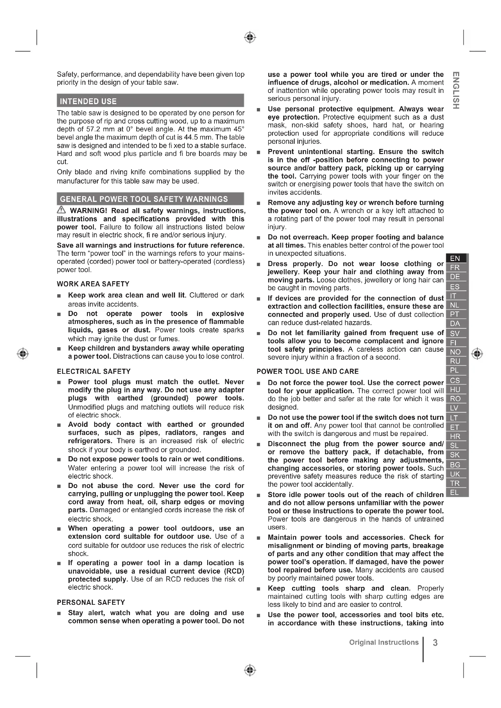 Original Instructions■ Never reach around or over a rotating saw blade. Reaching for a workpiece may lead to accidental contact with the moving saw blade. ■ Provide auxiliary workpiece support to the rear and/or sides of the saw table for long and/or wide workpieces to keep them level. A long and/or wide workpiece has a tendency to pivot on the table’s edge, causing loss of control, saw blade binding and kickback. ■ Feed workpiece at an even pace. Do not bend or twist the workpiece. If jamming occurs, turn the product off immediately, unplug the product then clear the jam. Jamming the saw blade by the workpiece can cause kickback or stall the motor. ■ Do not remove pieces of cut-off material while the saw is running. The material may become trapped between the fence or inside the saw blade guard and the saw blade pulling your fingers into the saw blade. Turn the saw off and wait until the saw blade stops before removing material. ■ Use an auxiliary fence in contact with the table top when ripping workpieces less than 2 mm thick. A thin workpiece may wedge under the rip fence and create a kickback.