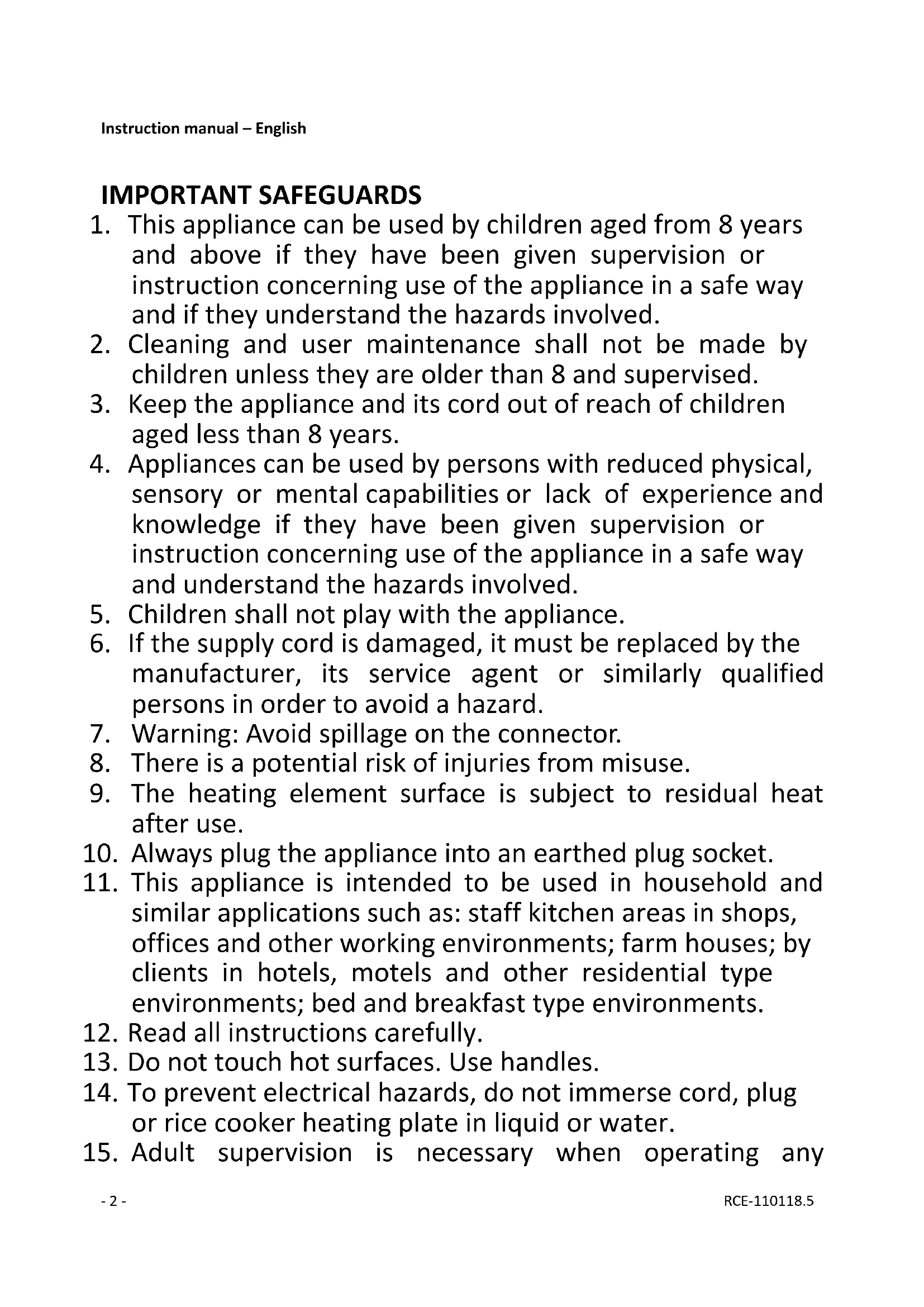 Caution, hot surface. WARNING!! Please do not touch surface while in use. The temperature of accessible surfaces may be high when the appliance is operating.- 4 - RCE-110118.5