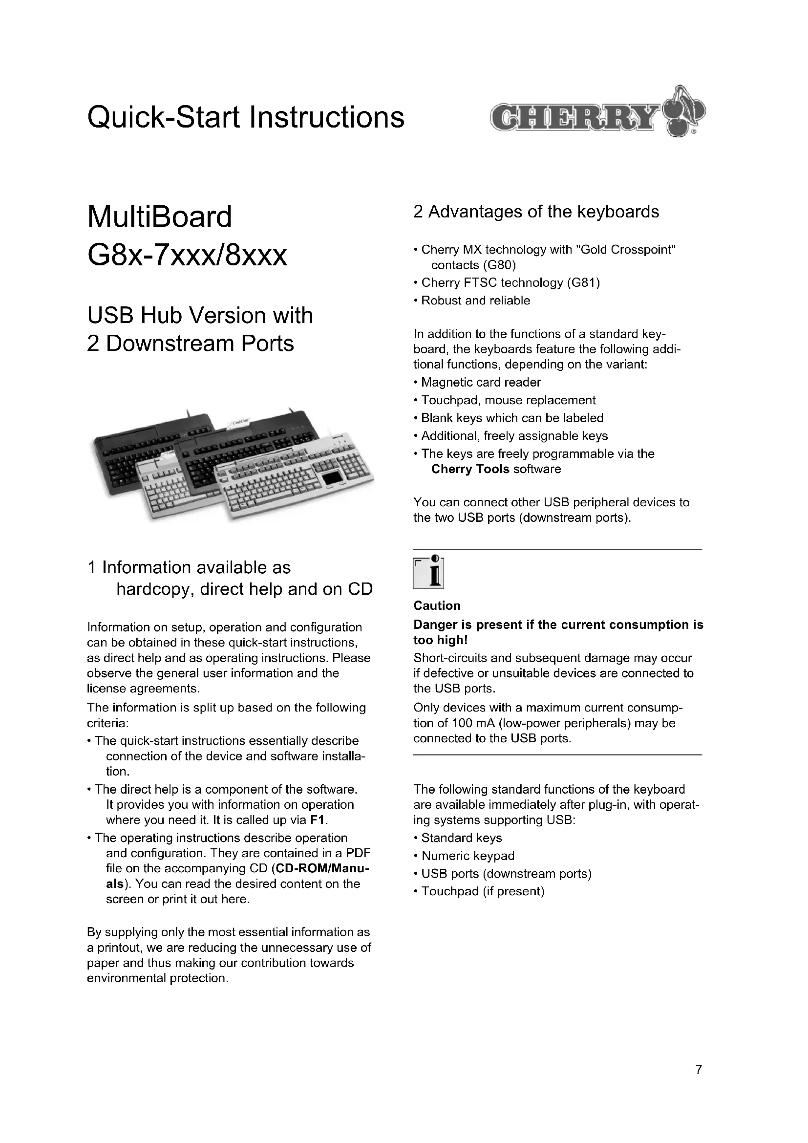 The keyboard performs a self-test when plugged in or when the PC is switched on: All of the LEDs illu- minate once briefly. In normal operation, the LEDs show the status of the locked-key function of the Num, Caps and Scroll keys. 3 Technical data of all variants Designation Value Interfaces USB plug, 2 USB downstream ports in accordance with USB 2.0 (full speed, 12 Mbit/s) Reading speed of magnetic card reader 3 to 125 ips at 75 bpi, 3 to 50 ips at 210 bpi (ips = inches per sec- ond, bpi = bits per inch) Total number of reads by magnetic card reader up to 1,000,000 Power supply +5 V/DC ±5 % SELV Current consumption max. 400 mA Current output max. 100 mA per downstream port Storage temperature range −20 °C to +60 °C Operating tempera- ture range 0 °C to +50 °C Cable length approx. 1.75 m 4 Technical data of the MultiBoard G81-7000 5 Technical data of the MultiBoard G81-8000 6 Technical data of the MultiBoard G80-8113 Designation Value Keyboard type 104/105 keys, magnetic card reader, 19" compact size, FTSC technology Weight (incl. packaging) approx. 2050 g Dimensions (L x W x H) 405 x 220 x 64 mm Designation Value Keyboard type 104/105 keys, magnetic card reader, FTSC technology Weight (incl. packaging) approx. 2250 g Dimensions (L x W x H) 470 x 220 x 64 mm Designation Value Keyboard type 120/121 keys, 41 of which can be labeled, magnetic card reader, touchpad, MX technol- ogy with "Gold Cross- point" contacts Touchpad resolution 1000 dpi Weight (incl. packaging) approx. 2000 g Dimensions (L x W x H) 470 x 220 x 64 mm9 7 Technical data of the MultiBoard G80-8200 8 Pin assignment of USB plug and port USB plug and port (downstream port) of the key- board Designation Value Keyboard type 120/121 keys, 48 of which can be labeled, magnetic card reader, MX technology with "Gold Crosspoint" con- tacts Weight (incl. packaging) approx. 2250 g Dimensions (L x W x H) 470 x 220 x 64 mm Pin Assignment 1+5 V 2 −DATA 3+DATA 4GND 9 Device connection Attaching the device via the USB port 1 Find a USB port on the back of your PC or on a Cherry keyboard with USB hub. 2 Insert the USB plug of the device into any USB port. 10 Installation of the software Installation consists of two steps: