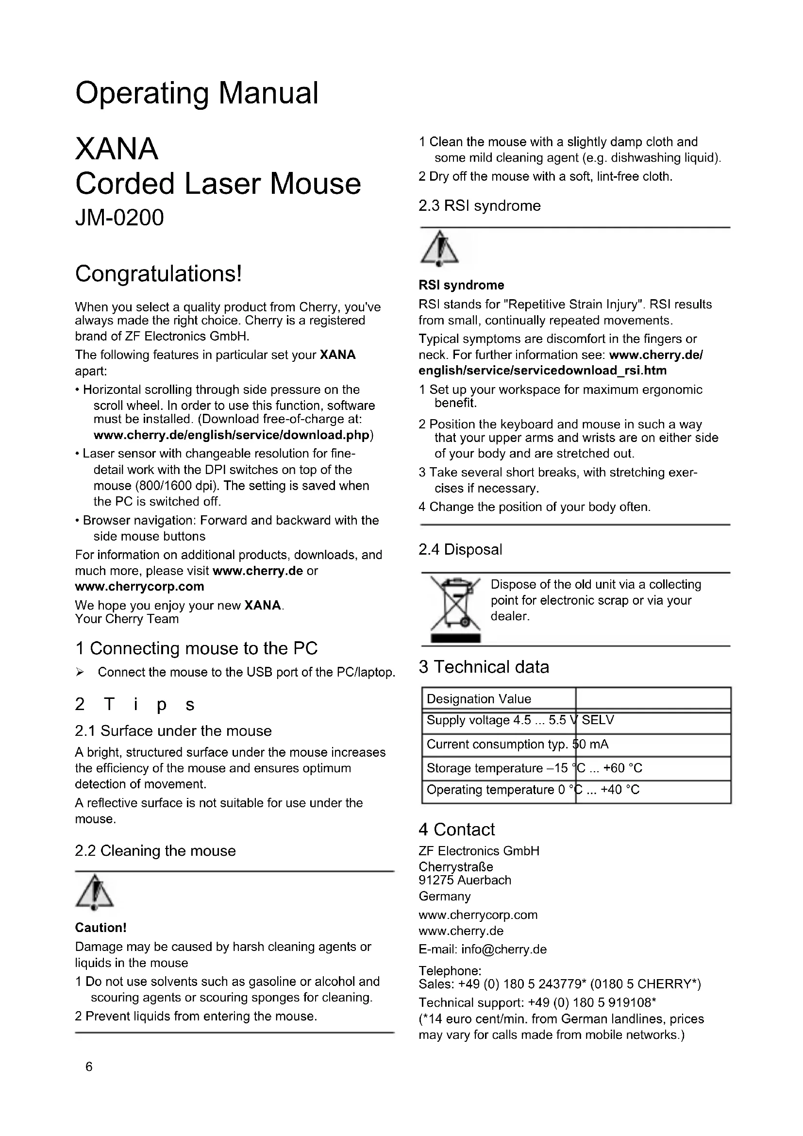 3 Technical data 4 Contact ZF Electronics GmbH Cherrystraße 91275 Auerbach Germany www.cherrycorp.com www.cherry.de E-mail: info@cherry.de Telephone: Sales: +49 (0) 180 5 243779* (0180 5 CHERRY*) Technical support: +49 (0) 180 5 919108* (*14 euro cent/min. from German landlines, prices may vary for calls made from mobile networks.) Dispose of the old unit via a collecting point for electronic scrap or via your dealer. Designation Value Supply voltage 4.5 ... 5.5 V SELV Current consumption typ. 50 mA Storage temperature –15 °C ... +60 °C Operating temperature 0 °C ... +40 °C Operating Manual7 Please have the following information on hand when contacting technical support: