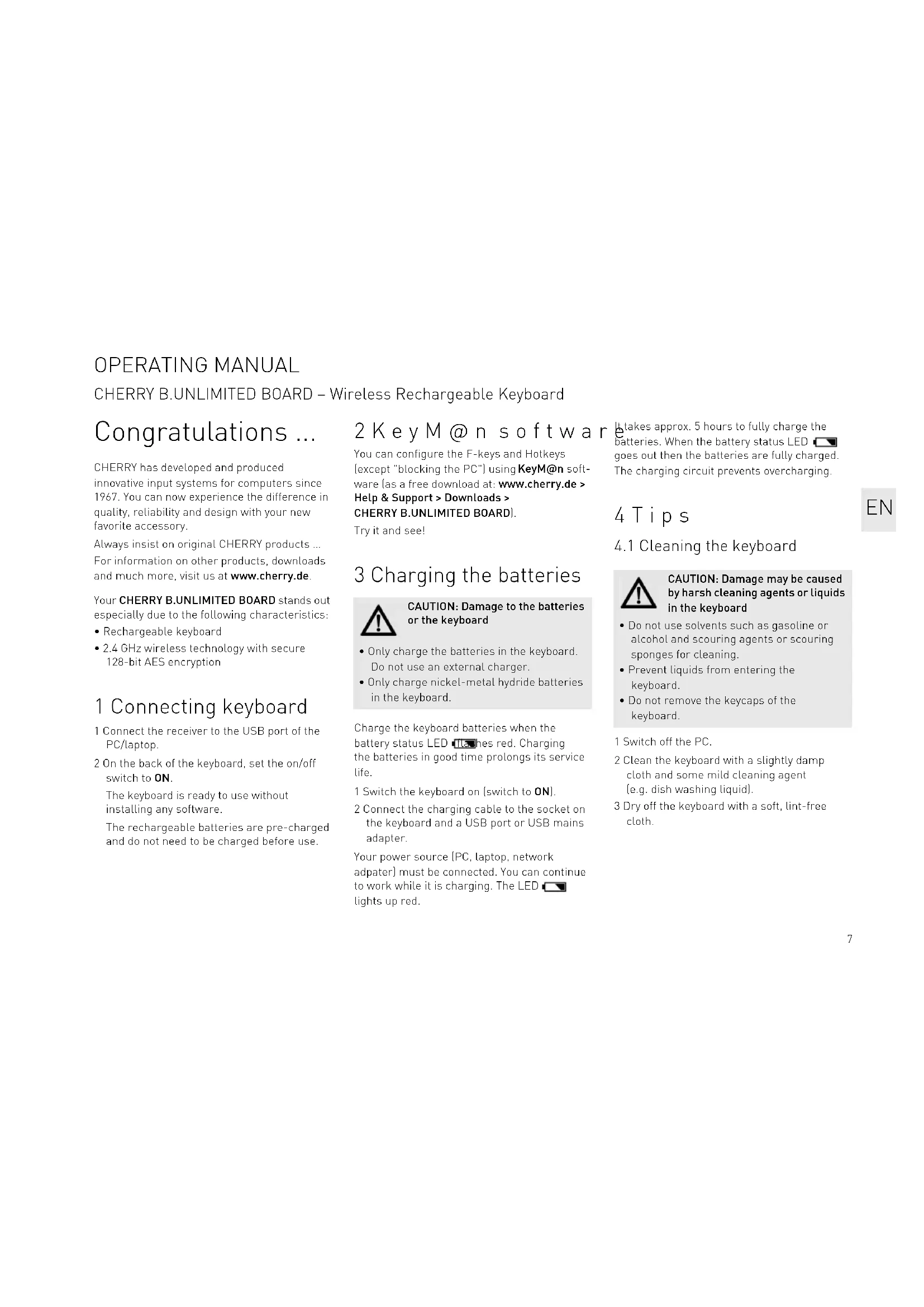 - Do not remove the keycaps of the keyboard. OPERATING MANUAL CHERRY B.UNLIMITED BOARD – Wireless Rechargeable Keyboard EN8
