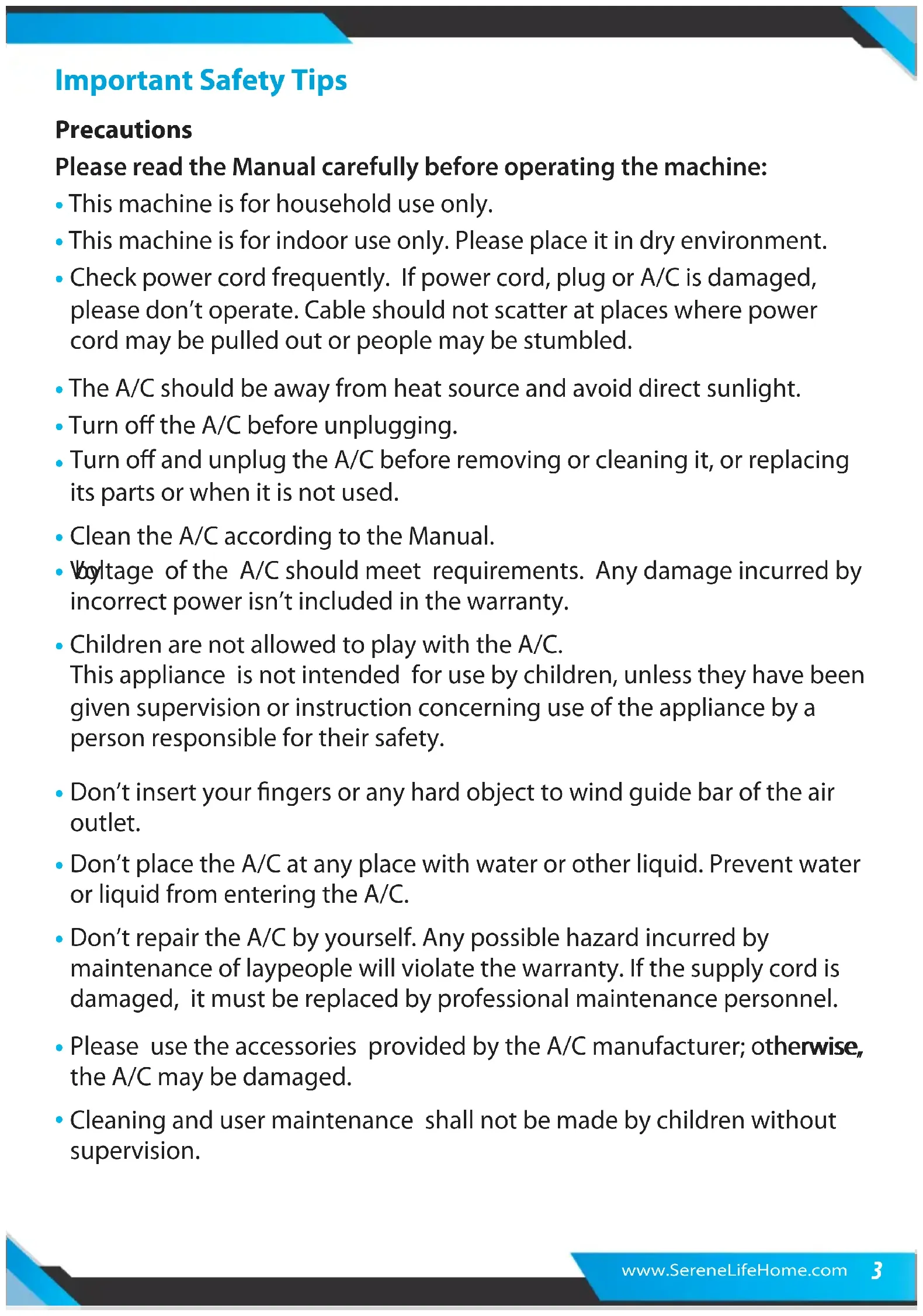 DAMAGE MAY BE CAUSED TO THE COMPRESSOR; IF IN DOUBT WE SUGGEST WAITING AT LEAST 24 HOURS FOLLOWING INSTALLTION BEFORE STARTING THE UNIT. This appliance is for indoor use only. This unit must be only connected to a 220-240 V / 50 Hz earthed outlet. Carefully read the instructions before installing and/or operating the unit. Installation must be in accordance with regulations of the country where the unit is used. If you are in any doubt about the suitability of your electrical supply have it checked and, if necessary, modified by a qualified electrician. This air conditioner has been tested and is safe to use. However, as with any electrical appliance - use it with care. This appliance is not intended for use by persons (including children) with reduce physical, sensory or mental capabilities. It is also not intended for use by those with a lack of experience and knowledge, unless they have been given supervision or instruction concerning the use of the appliance by a person responsible for their safety.www.SereneLifeHome.com