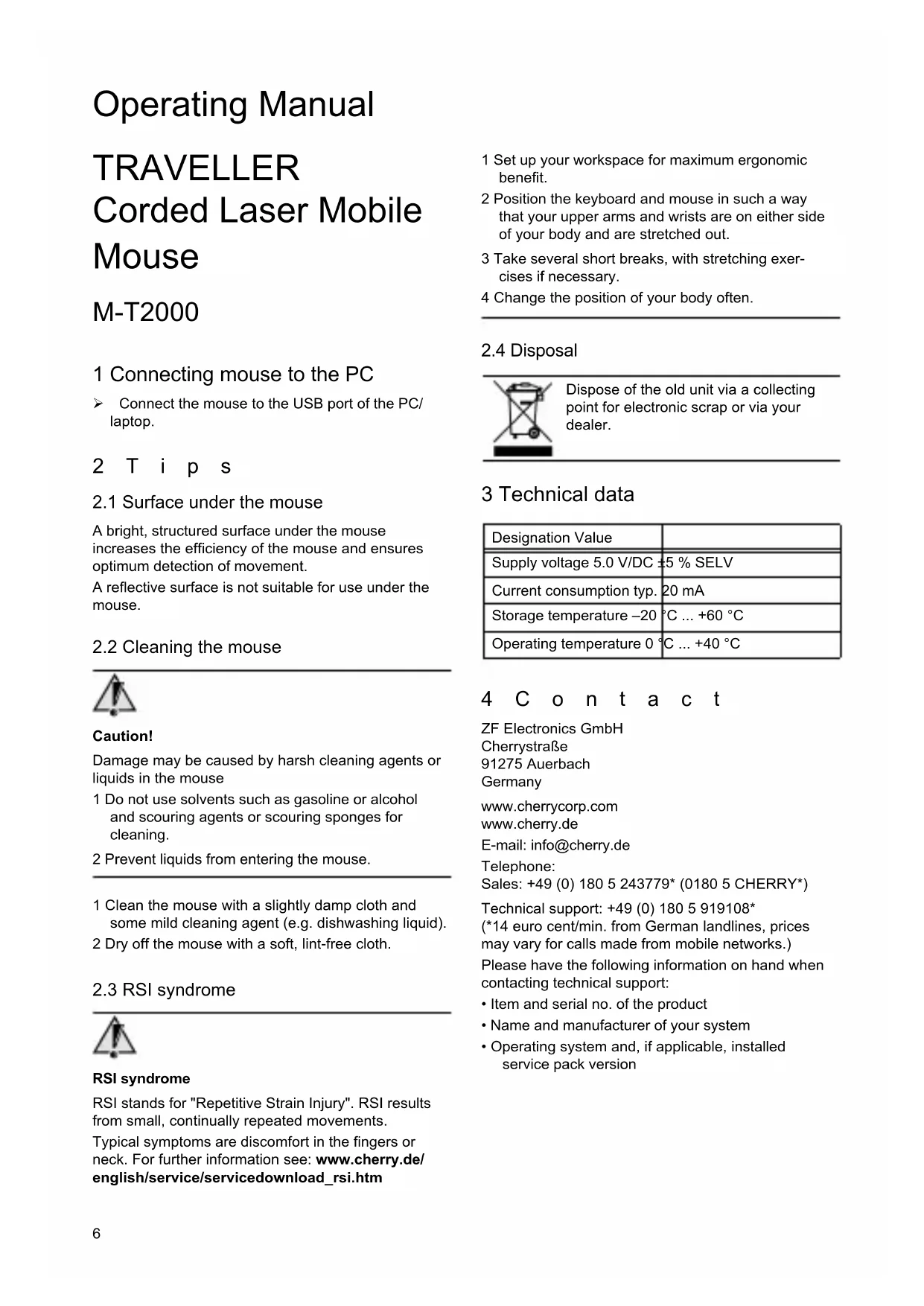 - Operating system and, if applicable, installed service pack version Dispose of the old unit via a collecting point for electronic scrap or via your dealer. Designation Value Supply voltage 5.0 V/DC ±5 % SELV Current consumption typ. 20 mA Storage temperature –20 °C ... +60 °C Operating temperature 0 °C ... +40 °C Operating Manual7 5 General advice Cherry, a brand of ZF Electronics GmbH, continuously optimizes its products as new technologies are developed. For this reason we reserve the right to make technical alterations. The evaluation of product reliability and the definition of the product's technical performance are carried out according to our own requirements in order to meet internationally recognized regulations and standards. Requirements in addition to these can be met through mutual cooperation. Improper usage, handling, storage and external influences could lead to faults and defects during use. We do not accept warranty for defects caused by alterations to our product by the user and shall not be held liable for unauthorized modifications. All repairs must be made by us or an officially appointed organization or person. Possible compensation claims against ZF Electronics GmbH or its nominated officers – whatever the legal justification including physical or stress related injuries – are excluded. Exceptions to this exist in the case of intent or gross negligence on the part of ZF Electronics GmbH, infringements of Product Liability Law or in cases of injury, bodily harm or risk to health. These operating instructions only apply to the accompanying product. Full details can be obtained from your distributor or direct from us. Class 1 Laser