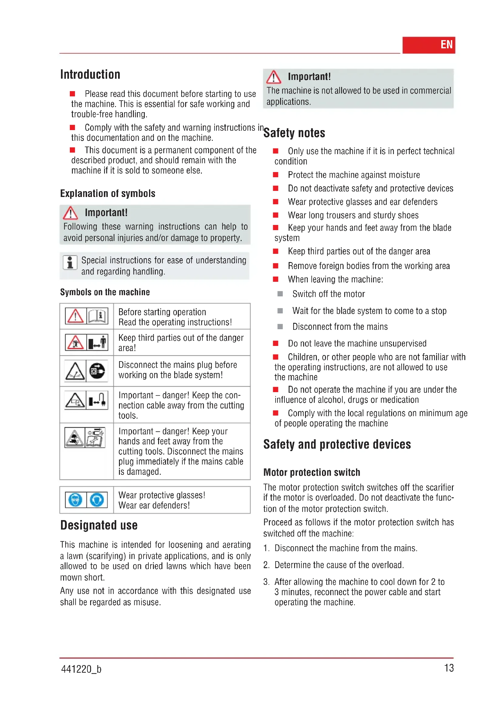Introduction Please read this document before starting to use the machine. This is essential for safe working and trouble-free handling. Comply with the safety and warning instructions in this documentation and on the machine. This document is a permanent component of the described product, and should remain with the machine if it is sold to someone else. Explanation of symbols Important! Following these warning instructions can help to avoid personal injuries and/or damage to property. Special instructions for ease of understanding and regarding handling. Symbols on the machine Before starting operation Read the operating instructions! Keep third parties out of the danger area! Disconnect the mains plug before working on the blade system! Important – danger! Keep the con- nection cable away from the cutting tools. Important – danger! Keep your hands and feet away from the cutting tools. Disconnect the mains plug immediately if the mains cable is damaged. Wear protective glasses! Wear ear defenders! Designated use This machine is intended for loosening and aerating a lawn (scarifying) in private applications, and is only allowed to be used on dried lawns which have been mown short. Any use not in accordance with this designated use shall be regarded as misuse. Important! The machine is not allowed to be used in commercial applications. Safety notes Only use the machine if it is in perfect technical condition Protect the machine against moisture Do not deactivate safety and protective devices Wear protective glasses and ear defenders Wear long trousers and sturdy shoes Keep your hands and feet away from the blade system Keep third parties out of the danger area Remove foreign bodies from the working area When leaving the machine: Switch off the motor Wait for the blade system to come to a stop Disconnect from the mains Do not leave the machine unsupervised Children, or other people who are not familiar with the operating instructions, are not allowed to use the machine Do not operate the machine if you are under the influence of alcohol, drugs or medication Comply with the local regulations on minimum age of people operating the machine Safety and protective devices Motor protection switch The motor protection switch switches off the scarifier if the motor is overloaded. Do not deactivate the func- tion of the motor protection switch. Proceed as follows if the motor protection switch has switched off the machine: