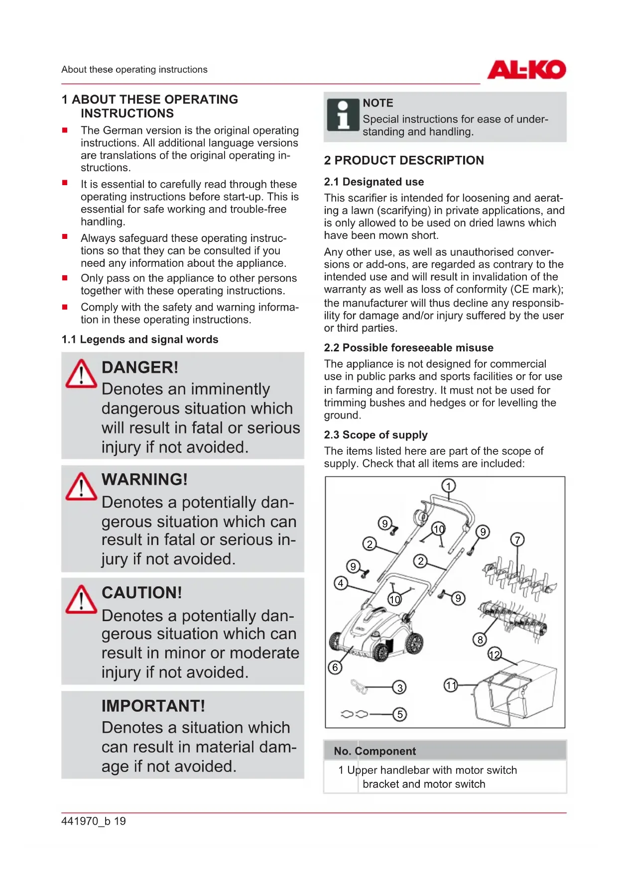No. Component 1 Upper handlebar, folding 2 Lower handlebar, rotatable 3 Motor switch bracket 4 Motor switch with safety push switch and integrated mains plug 5 Cable strain relief 6 Quick release for folding back the handlebar441970_b 21 Safety instructions No. Component 7 Rotary/snap-in joint with quick release for the handle height adjustment 8 Appliance carrying handle 9 Adjuster wheel for working depth 10 5-level working depth indicator 11 Blade system with scarifier or aerator roller 12 Baffle 13 Grass collector 14 Grass collector carrying handle 3 SAFETY INSTRUCTIONS