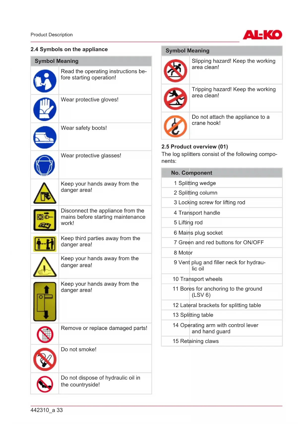 Symbol Meaning Read the operating instructions be- fore starting operation! Wear protective gloves! Wear safety boots! Wear protective glasses! Keep your hands away from the danger area! Disconnect the appliance from the mains before starting maintenance work! Keep third parties away from the danger area! Keep your hands away from the danger area! Keep your hands away from the danger area! Remove or replace damaged parts! Do not smoke! Do not dispose of hydraulic oil in the countryside! Symbol Meaning Slipping hazard! Keep the working area clean! Tripping hazard! Keep the working area clean! Do not attach the appliance to a crane hook!