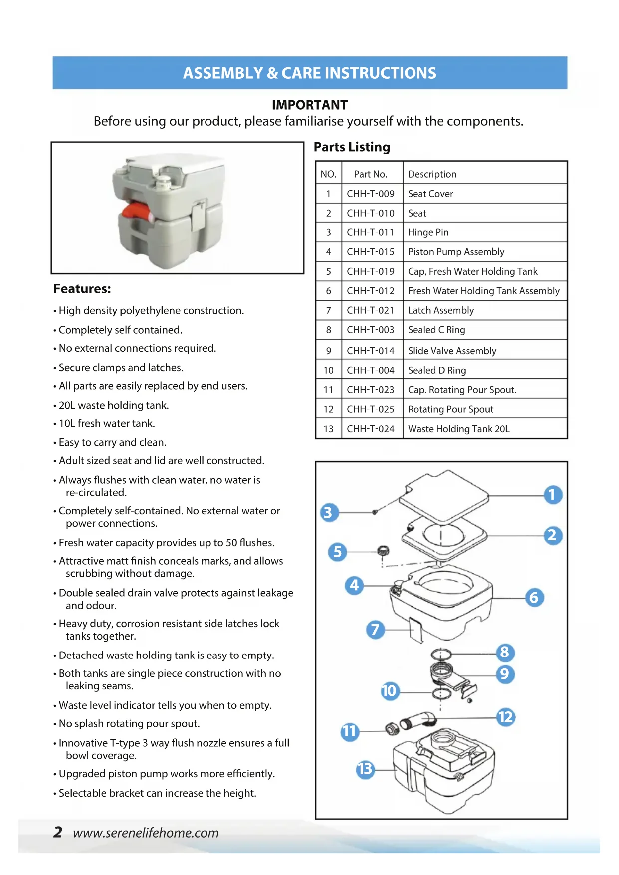 - Selectable bracket can increase the height. Description Seat Cover Seat Hinge Pin Piston Pump Assembly Cap, Fresh Water Holding Tank Fresh Water Holding Tank Assembly Latch Assembly Sealed C Ring Slide Valve Assembly Sealed D Ring Cap. Rotating Pour Spout. Rotating Pour Spout Waste Holding Tank 20L NO.