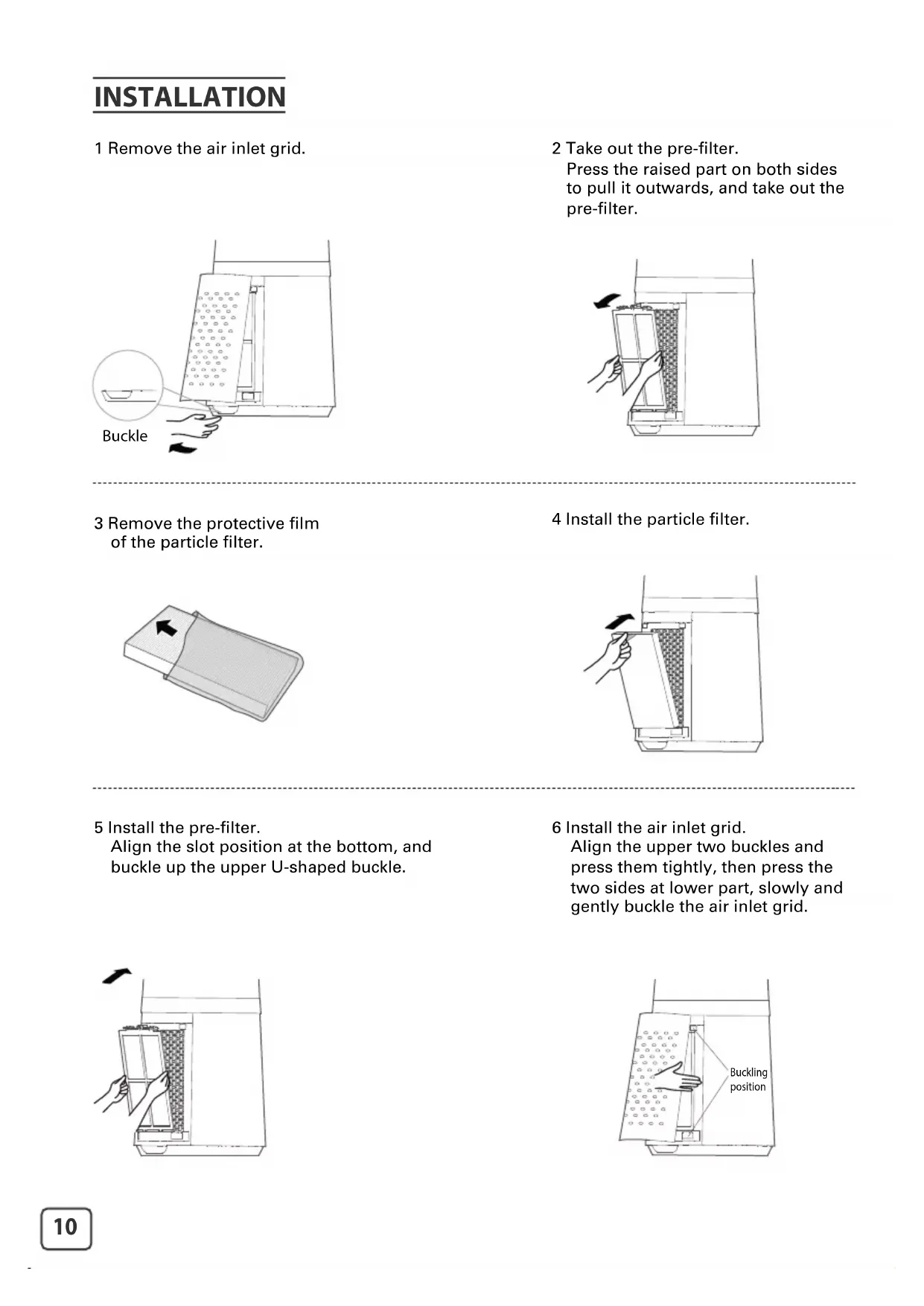 DESCRIPTION10 INSTALLATION 1 Remove the air inlet grid. 3 Remove the protective lm of the particle lter. 5 Install the pre-lter. Align the slot position at the bottom, and buckle up the upper U-shaped buckle. 6 Install the air inlet grid. Align the upper two buckles and press them tightly, then press the two sides at lower part, slowly and gently buckle the air inlet grid. 4 Install the particle lter. 2 Take out the pre-lter. Press the raised part on both sides to pull it outwards, and take out the pre-lter. Buckle Buckling positionEN