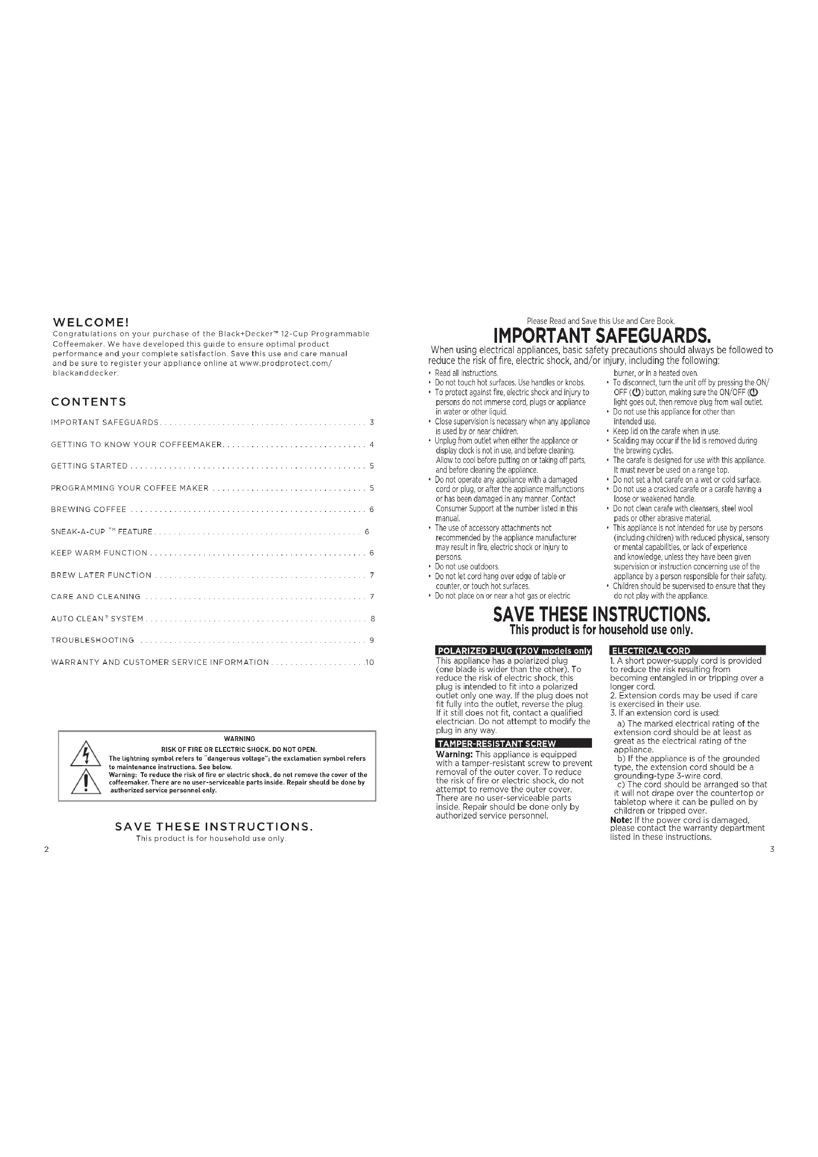 WELCOME! Congratulations on your purchase of the Black+Decker™ 12-Cup Programmable Coffeemaker. We have developed this guide to ensure optimal product performance and your complete satisfaction. Save this use and care manual and be sure to register your appliance online at www.prodprotect.com/blackanddecker. CONTENTS SAVE THESE INSTRUCTIONS. This product is for household use only. IMPORTANT SAFEGUARDS ........................................... 3