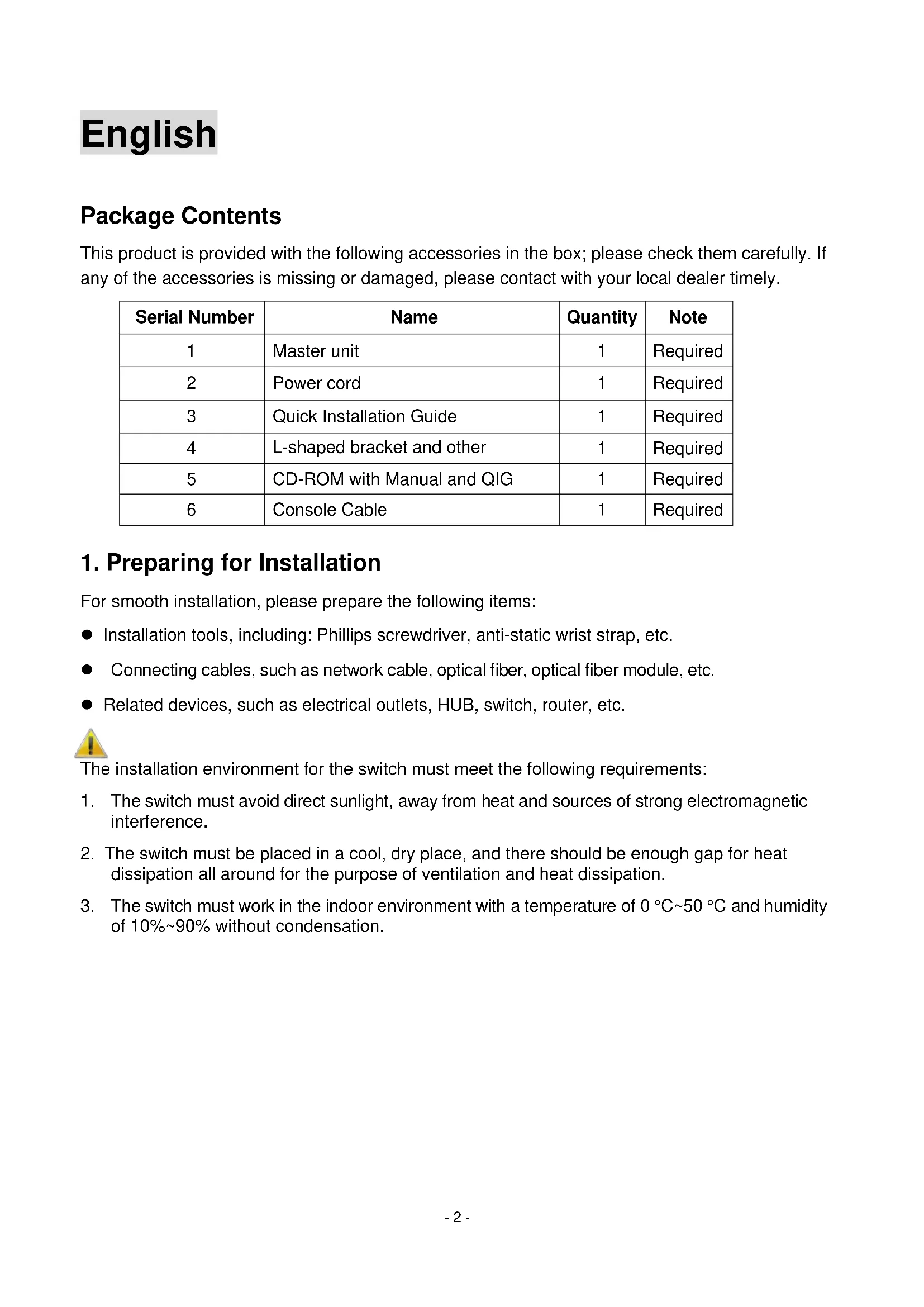 For smooth installation, please prepare the following items: Installation tools, including: Phillips screwdriver, anti-static wrist strap, etc. Connecting cables, such as network cable, optical fiber, optical fiber module, etc. Related devices, such as electrical outlets, HUB, switch, router, etc. The installation environment for the switch must meet the following requirements:
