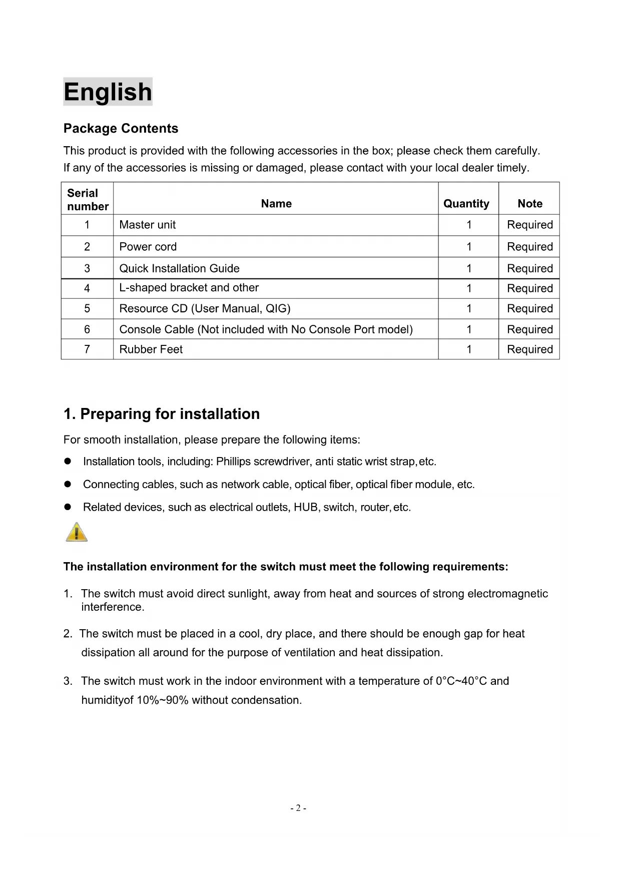 This Quick Installation Guide only describes the most basic situations and settings. All detailed information is described in the user manual.- 2 - English Package Contents This product is provided with the following accessories in the box; please check them carefully. If any of the accessories is missing or damaged, please contact with your local dealer timely. Serial number Name Quantity Note