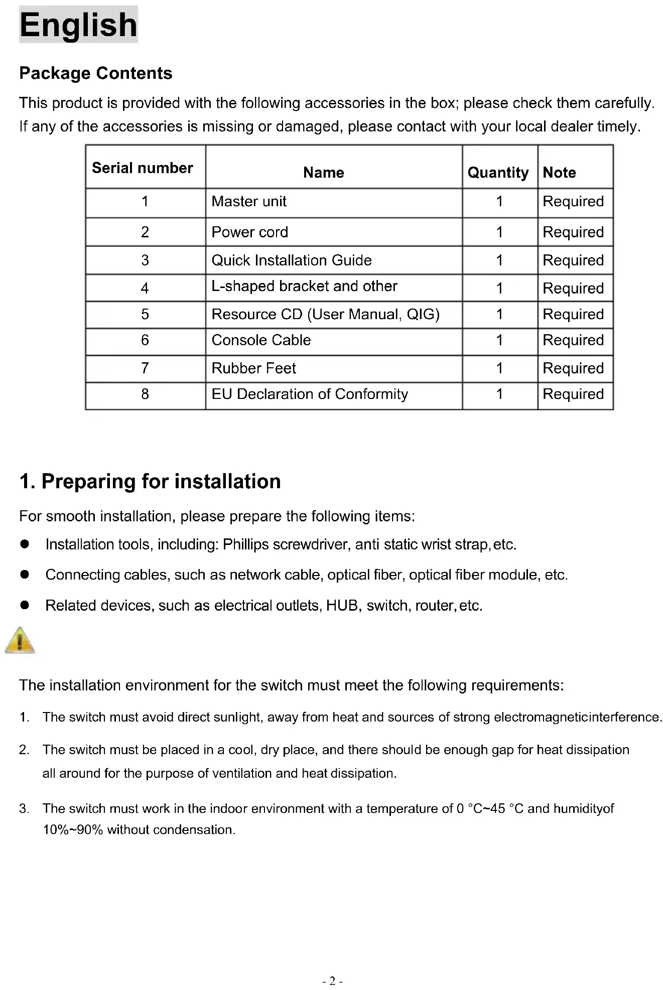 This Quick Installation Guide only describes the most basic situations and settings. All detailed information is described in the user manual.- 2 - English Package Contents This product is provided with the following accessories in the box; please check them carefully. If any of the accessories is missing or damaged, please contact with your local dealer timely. Serial number Name Quantity Note