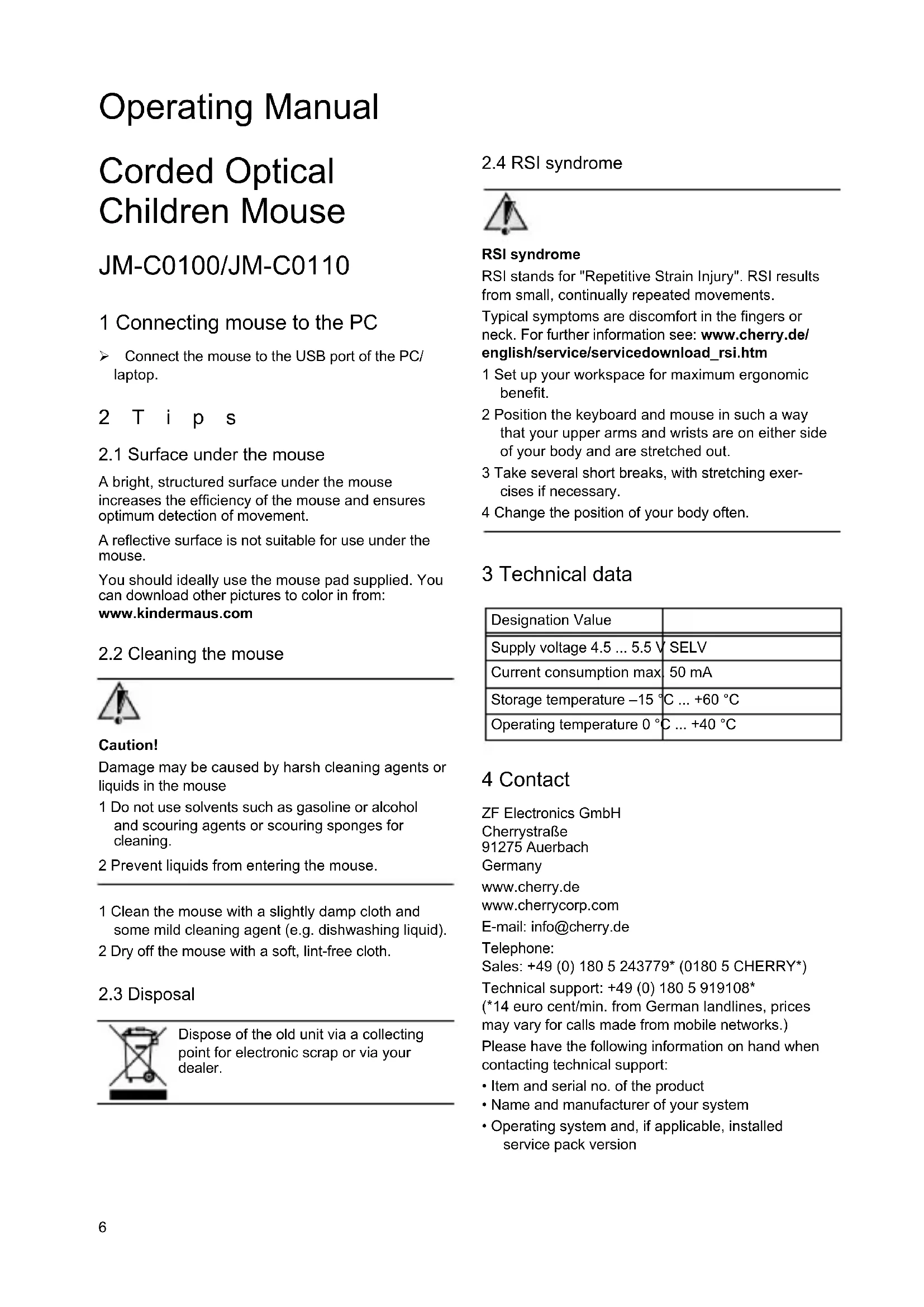 RSI syndrome RSI stands for "Repetitive Strain Injury". RSI results from small, continually repeated movements. Typical symptoms are discomfort in the fingers or neck. For further information see: www.cherry.de/ english/service/servicedownload_rsi.htm 1 Set up your workspace for maximum ergonomic benefit. 2 Position the keyboard and mouse in such a way that your upper arms and wrists are on either side of your body and are stretched out. 3 Take several short breaks, with stretching exer- cises if necessary. 4 Change the position of your body often. 3 Technical data 4 Contact ZF Electronics GmbH Cherrystraße 91275 Auerbach Germany www.cherry.de www.cherrycorp.com E-mail: info@cherry.de Telephone: Sales: +49 (0) 180 5 243779* (0180 5 CHERRY*) Technical support: +49 (0) 180 5 919108* (*14 euro cent/min. from German landlines, prices may vary for calls made from mobile networks.) Please have the following information on hand when contacting technical support: