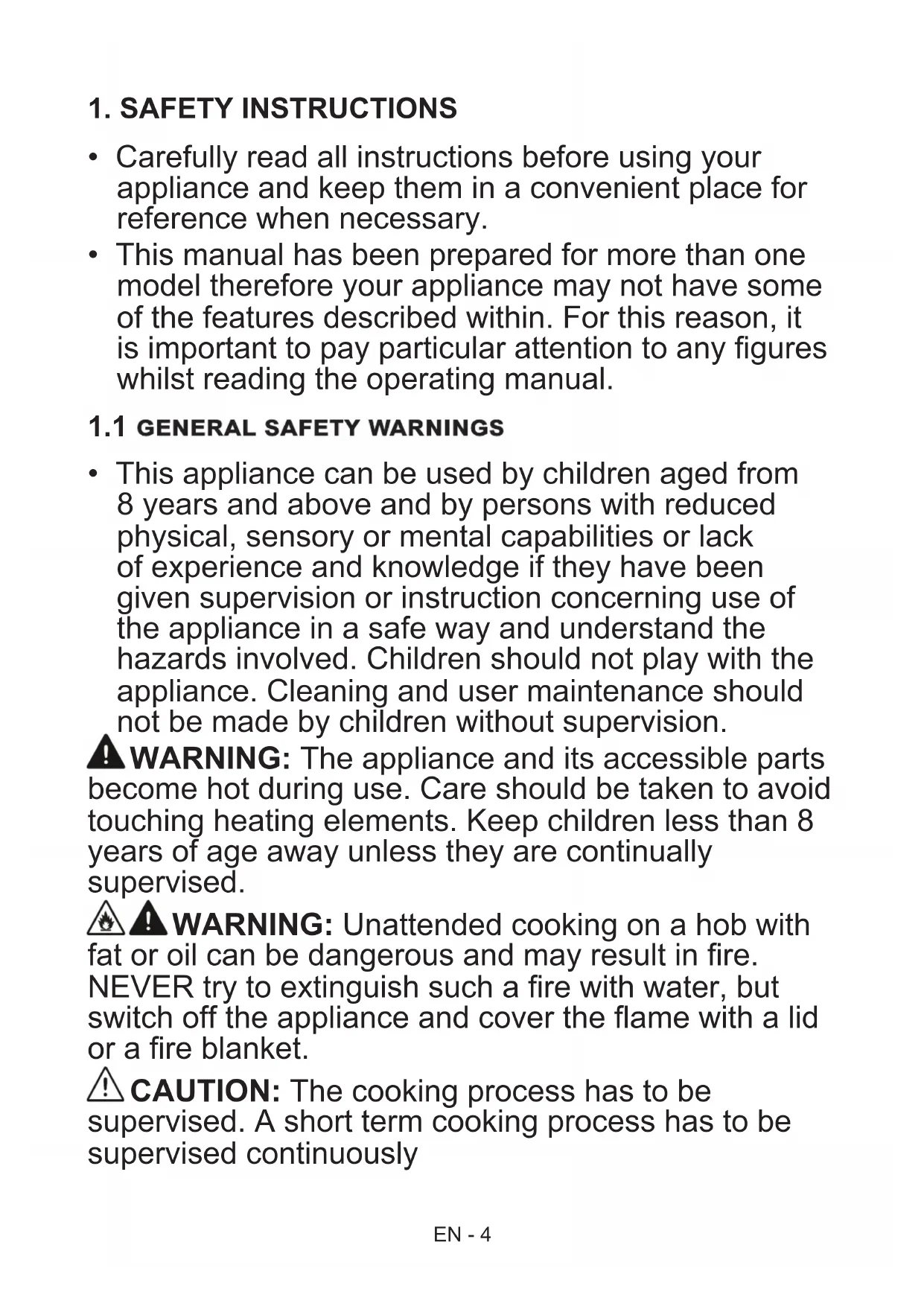 fat or oil can be dangerous and may result in fire. NEVER try to extinguish such a fire with water, but switch off the appliance and cover the flame with a lid or a fire blanket. CAUTION: The cooking process has to be supervised. A short term cooking process has to be supervised continuouslyEN - 5