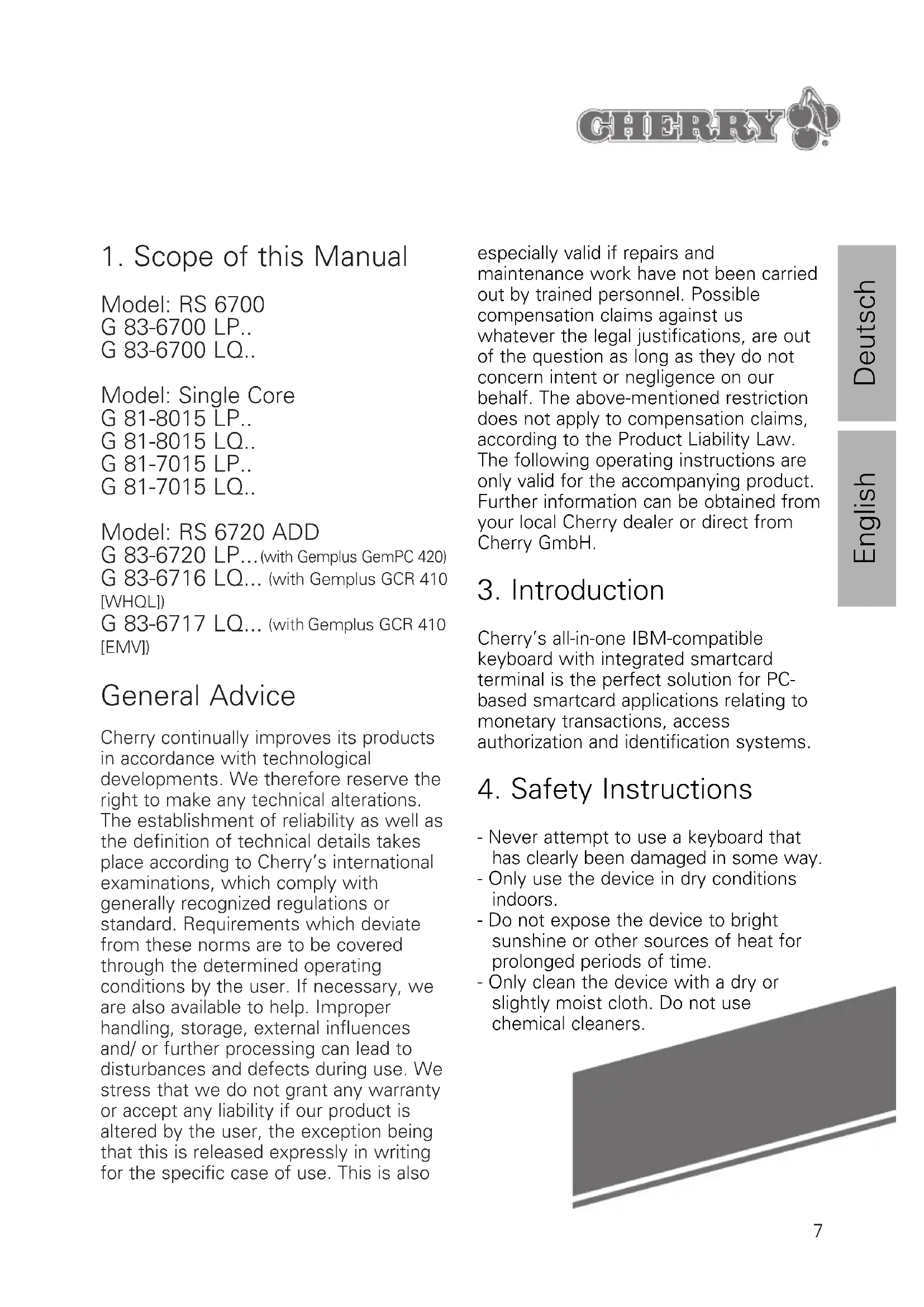 with Gemplus GCR 410 [WHQL]) G 83-6717 LQ... (with Gemplus GCR 410 [EMV]) General Advice Cherry continually improves its products in accordance with technological developments. We therefore reserve the right to make any technical alterations. The establishment of reliability as well as the definition of technical details takes place according to Cherry’s international examinations, which comply with generally recognized regulations or standard. Requirements which deviate from these norms are to be covered through the determined operating conditions by the user. If necessary, we are also available to help. Improper handling, storage, external influences and/ or further processing can lead to disturbances and defects during use. We stress that we do not grant any warranty or accept any liability if our product is altered by the user, the exception being that this is released expressly in writing for the specific case of use. This is also