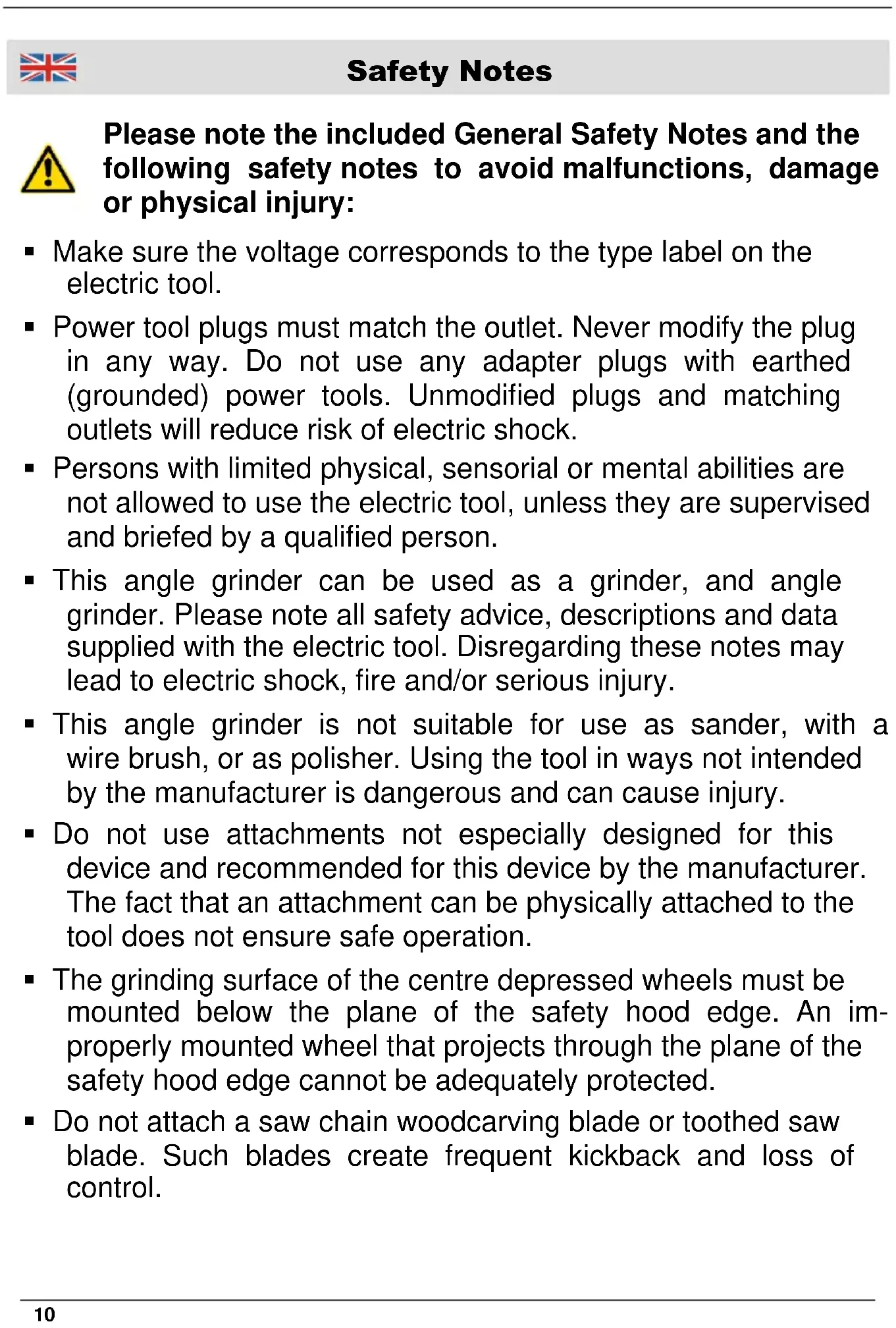 Make sure the voltage corresponds to the type label on the electric tool. Power tool plugs must match the outlet. Never modify the plug in any way. Do not use any adapter plugs with earthed (grounded) power tools. Unmodified plugs and matching outlets will reduce risk of electric shock. Persons with limited physical, sensorial or mental abilities are not allowed to use the electric tool, unless they are supervised and briefed by a qualified person. This angle grinder can be used as a grinder, and angle grinder. Please note all safety advice, descriptions and data supplied with the electric tool. Disregarding these notes may lead to electric shock, fire and/or serious injury. This angle grinder is not suitable for use as sander, with a wire brush, or as polisher. Using the tool in ways not intended by the manufacturer is dangerous and can cause injury. Do not use attachments not especially designed for this device and recommended for this device by the manufacturer. The fact that an attachment can be physically attached to the tool does not ensure safe operation. The grinding surface of the centre depressed wheels must be mounted below the plane of the safety hood edge. An im- properly mounted wheel that projects through the plane of the safety hood edge cannot be adequately protected. Do not attach a saw chain woodcarving blade or toothed saw blade. Such blades create frequent kickback and loss of control.
