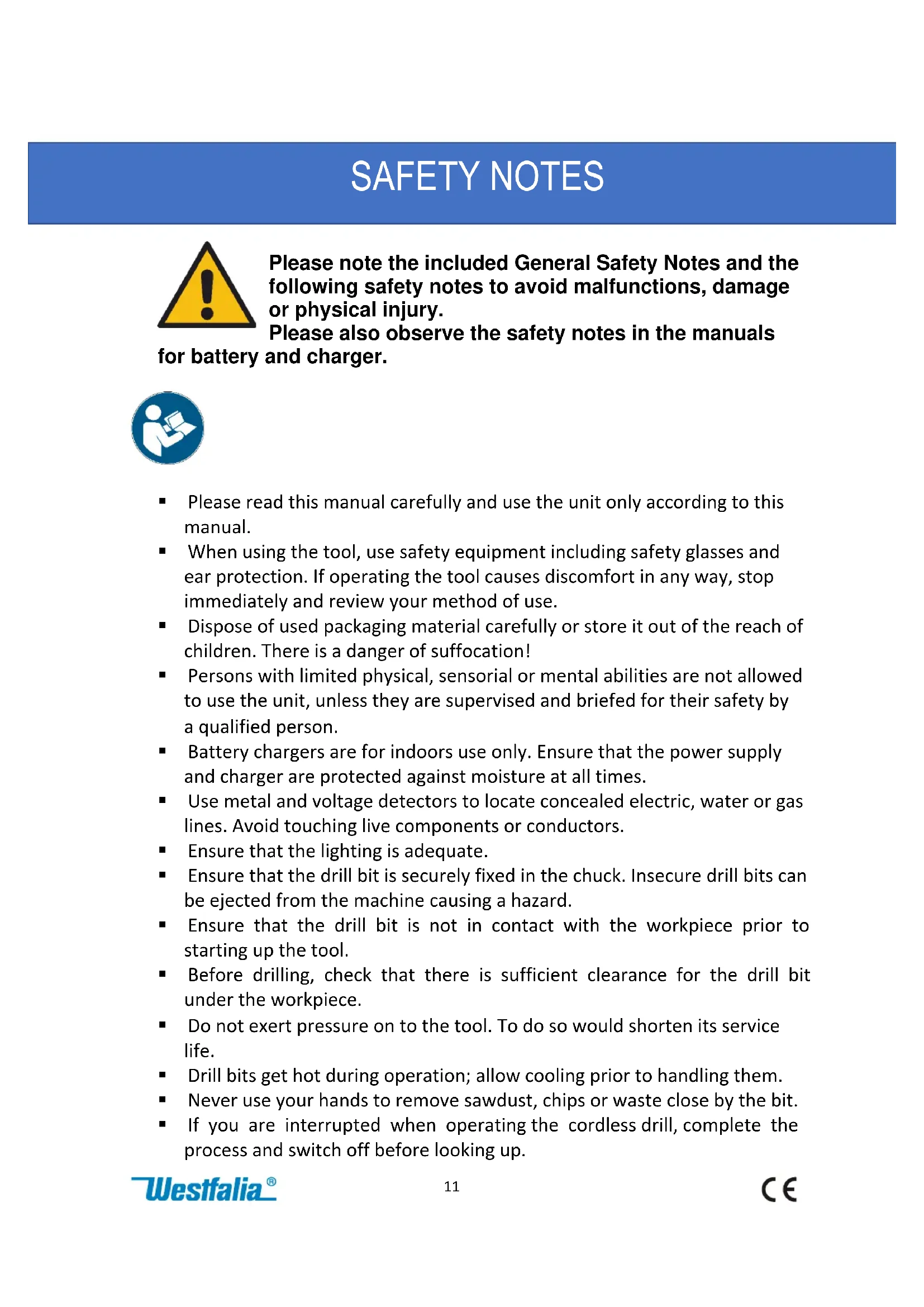 - If you are interrupted when operating the cordless drill, complete the process and switch off before looking up. SAFETY NOTES12