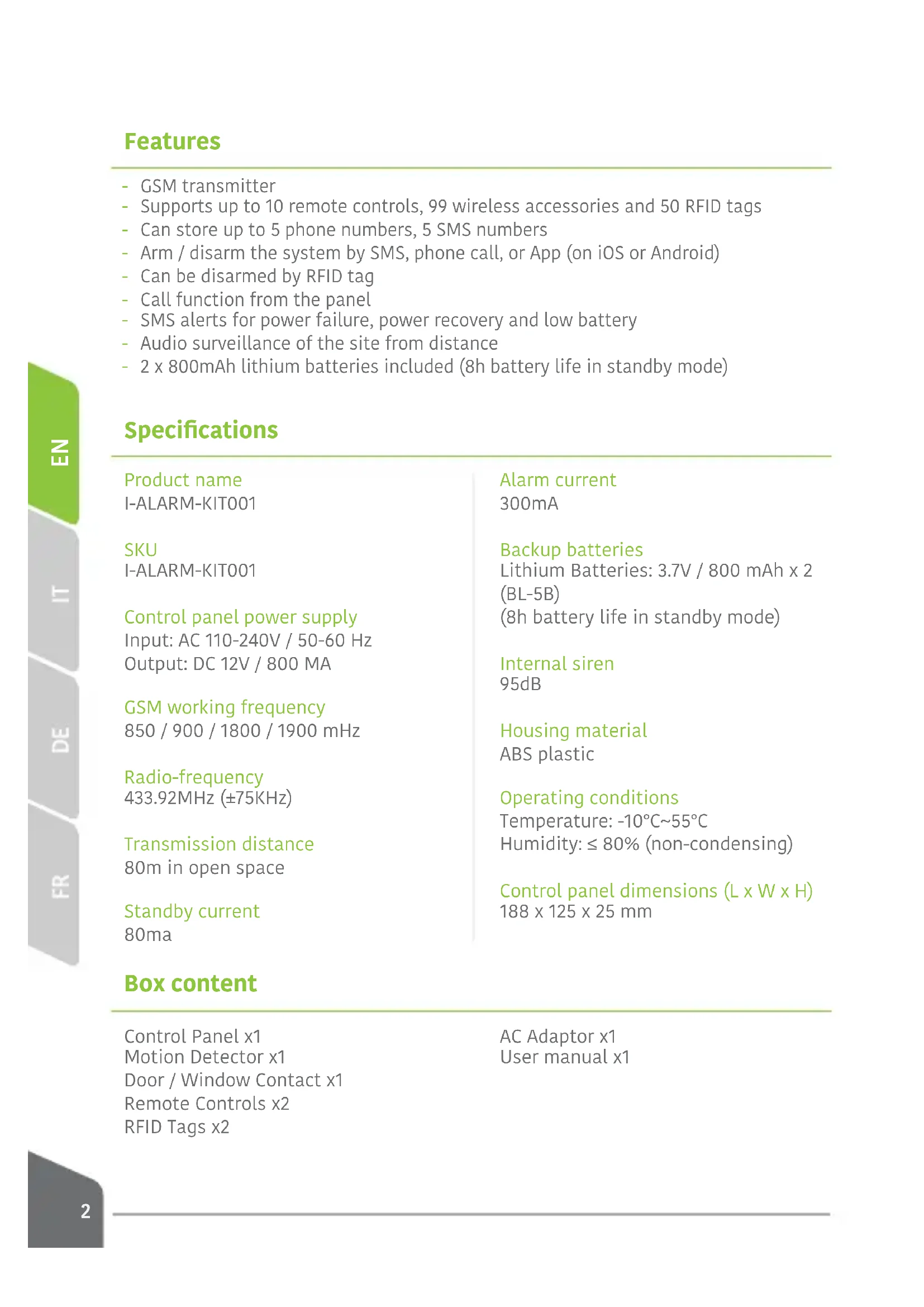 Features - GSM transmitter - Supports up to 10 remote controls, 99 wireless accessories and 50 RFID tags - Can store up to 5 phone numbers, 5 SMS numbers - Arm / disarm the system by SMS, phone call, or App (on iOS or Android) - Can be disarmed by RFID tag - Call function from the panel - SMS alerts for power failure, power recovery and low battery - Audio surveillance of the site from distance - 2 x 800mAh lithium batteries included (8h battery life in standby mode) Specications Product name I-ALARM-KIT001 SKU I-ALARM-KIT001 Control panel power supply Input: AC 110-240V / 50-60 Hz Output: DC 12V / 800 MA GSM working frequency 850 / 900 / 1800 / 1900 mHz Radio-frequency 433.92MHz (±75KHz) Transmission distance 80m in open space Standby current 80ma Alarm current 300mA Backup batteries Lithium Batteries: 3.7V / 800 mAh x 2 (BL-5B) (8h battery life in standby mode) Internal siren 95dB Housing material ABS plastic Operating conditions Temperature: -10°C~55°C Humidity: ≤ 80% (non-condensing) Control panel dimensions (L x W x H) 188 x 125 x 25 mm Box content Control Panel x1 Motion Detector x1 Door / Window Contact x1 Remote Controls x2 RFID Tags x2 AC Adaptor x1 User manual x1EN DE ITFR