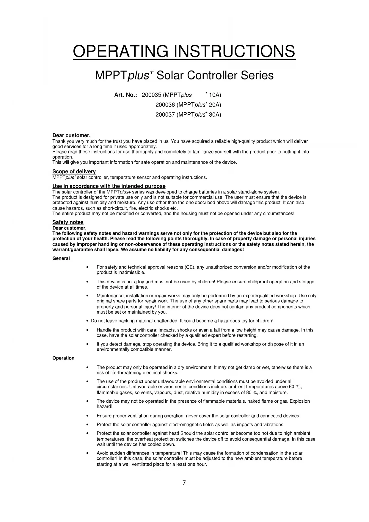 Dear customer, Thank you very much for the trust you have placed in us. You have acquired a reliable high-quality product which will deliver good services for a long time if used appropriately. Please read these instructions for use thoroughly and completely to familiarize yourself with the product prior to putting it into operation. This will give you important information for safe operation and maintenance of the device. Scope of delivery MPPTplus solar controller, temperature sensor and operating instructions. Use in accordance with the intended purpose The solar controller of the MPPTplus+ series was developed to charge batteries in a solar stand-alone system. The product is designed for private use only and is not suitable for commercial use. The user must ensure that the device is protected against humidity and moisture. Any use other than the one described above will damage this product. It can also cause hazards, such as short-circuit, fire, electric shocks etc. The entire product may not be modified or converted, and the housing must not be opened under any circumstances! Safety notes Dear customer, The following safety notes and hazard warnings serve not only for the protection of the device but also for the protection of your health. Please read the following points thoroughly. In case of property damage or personal injuries caused by improper handling or non-observance of these operating instructions or the safety notes stated herein, the warrant/guarantee shall lapse. We assume no liability for any consequential damages! General