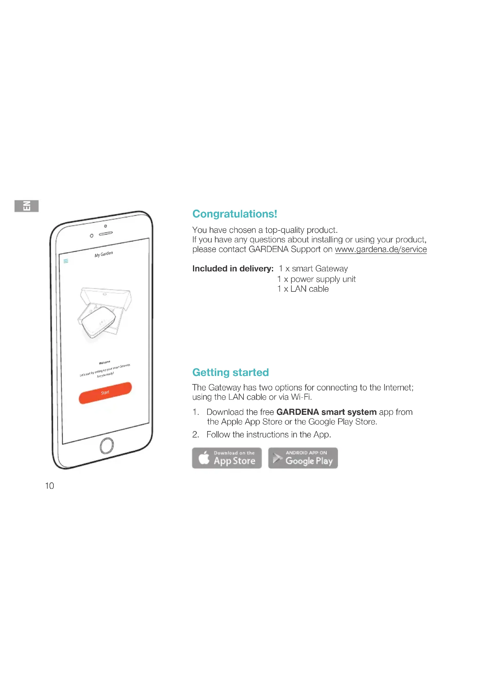 Congratulations! You have chosen a top-quality product. If you have any questions about installing or using your product, please contact GARDENA Support on www.gardena.de/service Included in delivery: 1 x smart Gateway 1 x power supply unit 1 x LAN cable Getting started The Gateway has two options for connecting to the Internet; using the LAN cable or via Wi-Fi.