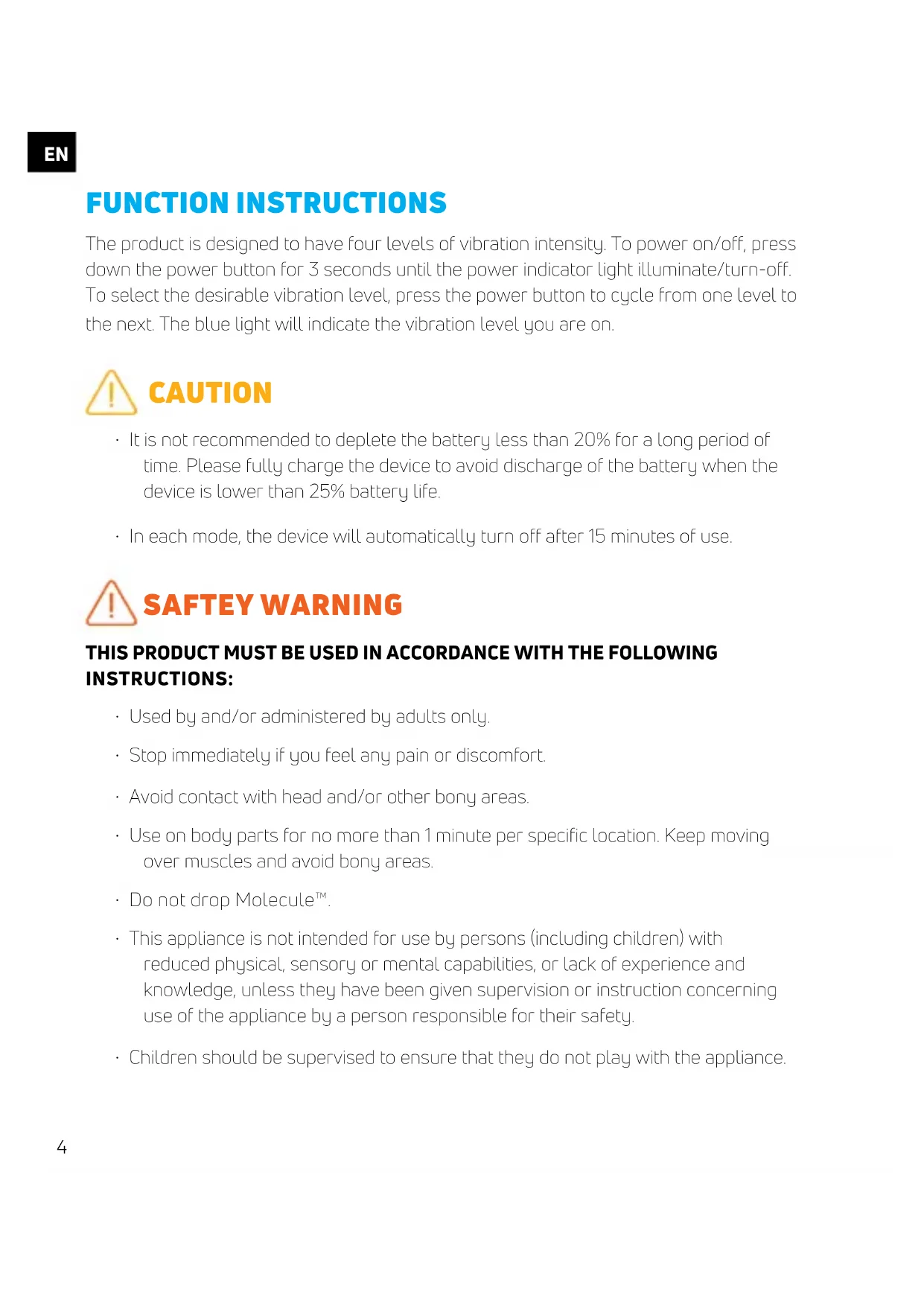 - In each mode, the device will automatically turn off after 15 minutes of use. SAFTEY WARNING THIS PRODUCT MUST BE USED IN ACCORDANCE WITH THE FOLLOWING INSTRUCTIONS:
