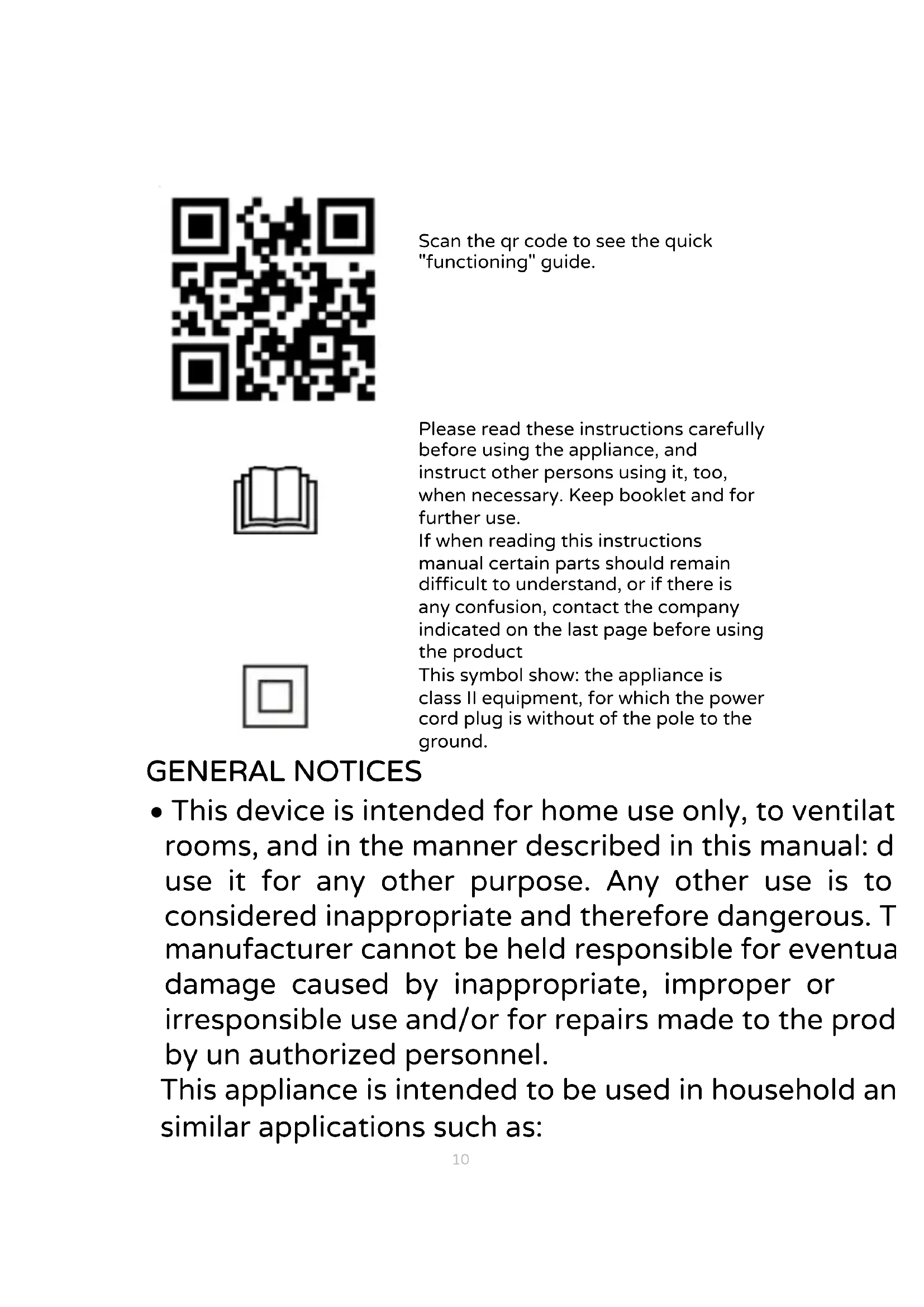 This symbol show: the appliance is class II equipment, for which the power cord plug is without of the pole to the ground. GENERAL NOTICES This device is intended for home use only, to ventilate rooms, and in the manner described in this manual: do not use it for any other purpose. Any other use is to be considered inappropriate and therefore dangerous. The manufacturer cannot be held responsible for eventual damage caused by inappropriate, improper or irresponsible use and/or for repairs made to the product by un authorized personnel. This appliance is intended to be used in household and similar applications such as:11 - staff kitchen in shops, offices and other working environments; - farm houses - by clients in hotels, motels and other residential type environments - bed and breakfast type environments Do not touch the appliance with wet hands or feet. Do not insert any tool, or your fingers, into the grille protecting the blades. This appliance can be used by children aged from 8 years and above and persons with reduced physical, sensory or mental capabilities or lack of experience and knowledge if they have been given supervision or instruction concerning use of the appliance in a safe way and if they understand the hazards involved. Children shall not play with the appliance. Cleaning and user maintenance shall not be made by children without supervision. This appliance can be used by children aged 8 and older and by persons with reduced physical, sensory or mental capabilities or lack of experience and knowledge if they are properly supervised or if they have received instructions regarding the safe use of the appliance and have understood the related dangers. Children should not play with the appliance. Cleaning and maintenance should not be performed by children unless they are older than 8 years of age and are supervised. The appliance must be kept out of children’s reach.12 Attention: when using electric appliances, the basic safety precautions must always be observed to avoid risks of fire, electric shocks and physical injury. Do not use the appliance if it is not operating correctly or seems damaged; if in doubt, contact professionally qualified personnel. Make sure that the appliance is working correctly: if not, turn the appliance off and have it checked by professionally qualified personnel. Do not move the appliance when it is operating. Unplug the appliance when not in use. Do not use the device at room temperatures above 40 °C. Do not move the appliance when it is in function. Do not leave the device exposed to the weather (sun, rain, etc.). Do not pull on the cord to disconnect the plug from the socket. Do not allow children, or irresponsible persons, to use the device without supervision. If the electric cord is damaged, it has to be replaced by the supplier or an authorized service center or a professionally qualified, to avoid any risks. Do not use the appliance with a timer or a programmer or with a system that can switch on the appliance automatically, to avoid risk of fire, since a13 fire risk exists if the appliance is covered or positioned incorrectly. Ensure that the fan is switched off from the supply mains before removing the guard. INSTALLATION After removing the packing materials, check the integrity of the heater; if you are unsure, do not use it and ask for qualified professional help. The packing materials (plastic bags, polystyrene foam, nails, etc.) must be kept out the reach of children because they are potential sources of danger. Attention: any stickers or advertising material applied to the grid removed before using the appliance. The manufacturer declines all responsibility in case this is not safe working practices will be respected. Before connecting the appliance, check that the voltage values shown on the data plate correspond to those of the electricity supply network. In the event of incompatibility between the electric outlet and the plug of the appliance, have the outlet replaced with another more suitable type by professionally qualified personnel, who will make sure that the section of the wires of the outlet is appropriate for the absorbed power of the appliance. In general, the use of adapters or extension cords is not recommended; if their use is indispensable, they must conform to existing safety standards and their current capacity (amperes) must not be less that the maximum of the heater. The power socket must be easy to reach so the plug can be removed quickly in case of emergency. Do not place the fan on a shelf and/or near sinks or other container of liquids (minimum distance of 2 meters) to avoid the risk of it falling in. Keep the fan far away from fabrics (curtains, etc.) or unstable materials that could obstruct the air intake grille; make sure that the front is free of unstable materials (dust, etc.). Make sure that the electric cord is not touching rough, hot or moving surfaces and not twisted or wrapped around the appliance. Stand the appliance on a horizontal, flat surface or table; do not stand on a inclined plane (the appliance could upset). Do not place the appliance near an open flame, cooking or other heating appliance. In the event of a breakdown or poor operation, turn the fan heater off and ask for professionally qualified help.14