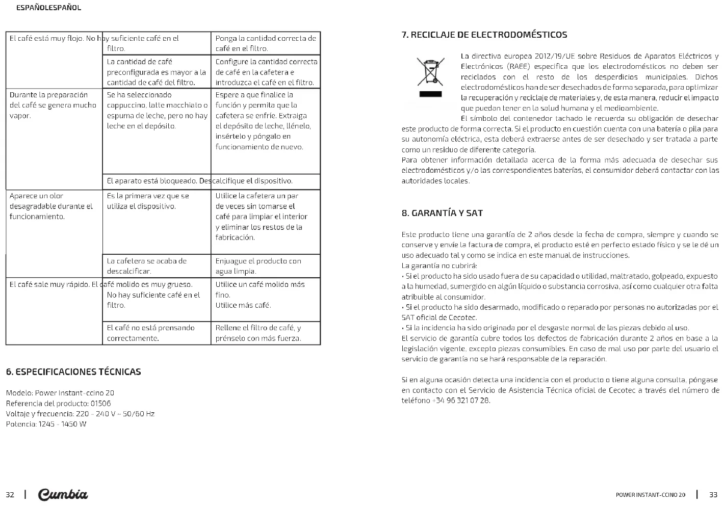 - Faults deriving from the normal wear and tear of its parts, due to use. The warranty service covers every manufacturing defects of your appliance for 2 years, based on current legislation, except consumable parts. In the event of misuse, the warranty will not apply. If at any moment you detect any problem with your product or have any doubt, do not hesitate to contact Cecotec Technical Support Service at +34 963 210 728.POWER INSTANT-CCINO 20