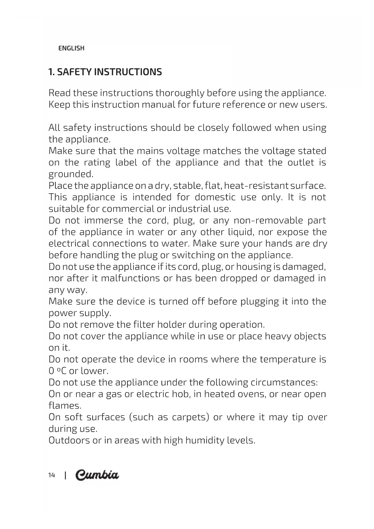 Read these instructions thoroughly before using the appliance. Keep this instruction manual for future reference or new users. All safety instructions should be closely followed when using the appliance. Make sure that the mains voltage matches the voltage stated on the rating label of the appliance and that the outlet is grounded. Place the appliance on a dry, stable, flat, heat-resistant surface. This appliance is intended for domestic use only. It is not suitable for commercial or industrial use. Do not immerse the cord, plug, or any non-removable part of the appliance in water or any other liquid, nor expose the electrical connections to water. Make sure your hands are dry before handling the plug or switching on the appliance. Do not use the appliance if its cord, plug, or housing is damaged, nor after it malfunctions or has been dropped or damaged in any way. Make sure the device is turned off before plugging it into the power supply. Do not remove the filter holder during operation. Do not cover the appliance while in use or place heavy objects on it. Do not operate the device in rooms where the temperature is 0 ºC or lower. Do not use the appliance under the following circumstances: On or near a gas or electric hob, in heated ovens, or near open flames. On soft surfaces (such as carpets) or where it may tip over during use. Outdoors or in areas with high humidity levels. 01595 / 01596_Capricciosa White/ Black_Manual_YV01191224.indd 1401595 / 01596_Capricciosa White/ Black_Manual_YV01191224.indd 14 24/12/19 14:5324/12/19 14:53CAPRICCIOSA WHITE / BLACK