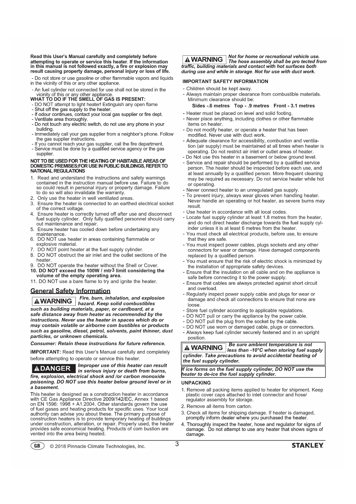 BL. BLUE RD. RED BK. BLACK WT. WHITE GN. GREEN YN. YELLOW© 2018 Pinnacle Climate Technologies, Inc. Read this User’s Manual carefully and completely before attempting to operate or service this heater. If the information in this manual is not followed exactly, a fire or explosion may result causing property damage, personal injury or loss of life. - Do not store or use gasoline or other flammable vapors and liquids in the vicinity of this or any other appliance. - An fuel cylinder not connected for use shall not be stored in the vicinity of this or any other appliance. WHAT TO DO IF THE SMELL OF GAS IS PRESENT: - DO NOT attempt to light heater! Extinguish any open flame - Shut off the gas supply to the heater. - If odour continues, contact your local gas supplier or fire dept. - Ventilate area thoroughly. - Do not touch any electric switch, do not use any phone in your building. - Immediately call your gas supplier from a neighbor’s phone. Follow the gas supplier instructions. - If you cannot reach your gas supplier, call the fire department. - Service must be done by a qualified service agency or the gas supplier. NOT TO BE USED FOR THE HEATING OF HABITABLE AREAS OF DOMESTIC PREMISES;FOR USE IN PUBLIC BUILDINGS, REFER TO NATIONAL REGULATIONS