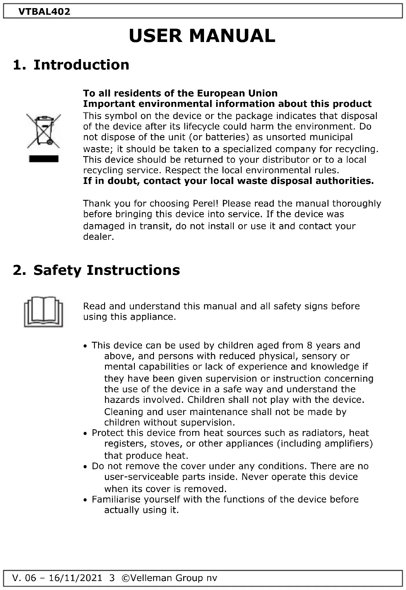 The copyright to this manual is owned by Velleman Group nv. All worldwide rights reserved. No part of this manual may be copied, reproduced, translated or reduced to any electronic medium or otherwise without the prior written consent of the copyright holder.VTBAL402