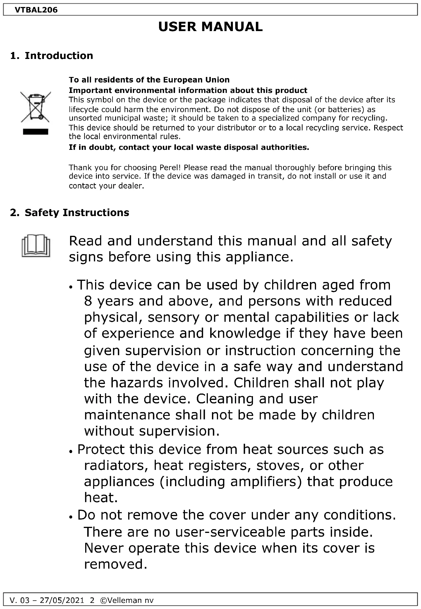 The copyright to this manual is owned by Velleman nv. All worldwide rights reserved. No part of this manual may be copied, reproduced, translated or reduced to any electronic medium or otherwise without the prior written consent of the copyright holder.VTBAL206