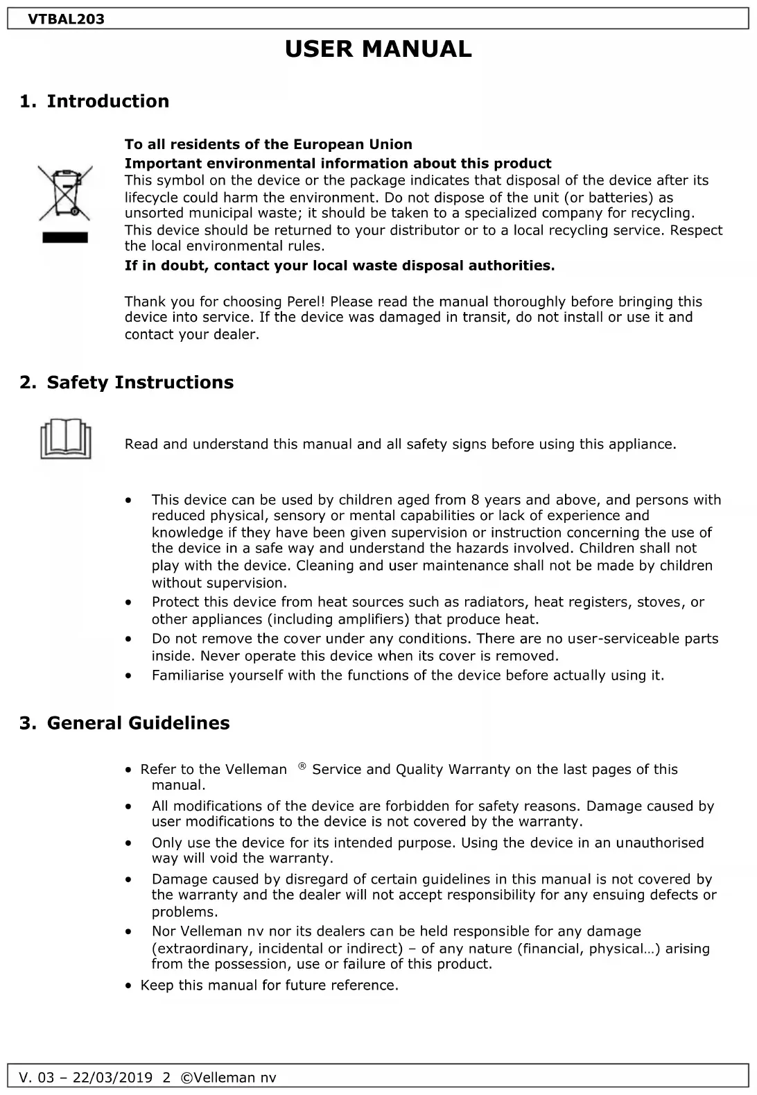 The copyright to this manual is owned by Velleman nv. All worldwide rights reserved. No part of this manual may be copied, reproduced, translated or reduced to any electronic medium or otherwise without the prior written consent of the copyright holder.VTBAL203