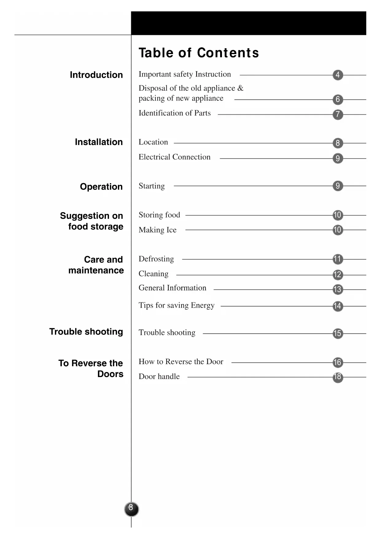 Warning w Keep ventilation openings, in the appliance enclosure or in the built-in structure, clear of obstruction. w Do not use mechanical devices or other means to accelerate the defrosting process, other than those recommended by the manufacturer. w Do not damage the refrigerant circuit. w Do not use electrical appliances inside the food storage compartments of the appliance, unless they are of the type recommended by the manufacturer. w The refrigerant and insulation blowing gas used in he appliance require special disposal procedures. At disposal, please consult with service agent or a similarly qualified person. Grounding (Earthing) In the event of an electric short circuit, grounding (earthing) reduces the risk of electric shock by providing an escape wire for the electric current. In order to prevent possible electric shock, this appliance must be grounded. Improper use of the grounding plug can result in an electric shock. Consult a qualified electrician or service person if the grounding instructions are not completely understood, or if you have doubts on whether the appliance is properly grounded. Accessibility of Supply Plug Supply Cord Replacement The supply plug of the refrigerator-freezer should be placed in easy accessible position for quick disconnection in emergency. If the supply cord is damaged, it must be replaced by the manufacturer or its service agent or a similarly qualified person in order to avoid a hazard.Introduction Disposal of the old appliance Disposal of the old appliance & packing of new appliance The old appliance whose life has expired should be destroyed in order to make it safe prior to disposal. Take out power plugs, separate connection wires and remove or destroy all springs, latches or bolting, to prevent children from being trapped during play. For environmental protection, old refrigerators should be disposed off by a professional disposition agency. If you have any question, please consult with the local sale agency or local authority. Disposal of packing of new appliance All packing materials used for this appliance are environment-friendly. Matters concerning material are as follows: PE : Polyethylene – Foil or pocket for packing PS : Formed objects made of foamed CFC-FREE polystyrene PP : Strapping tape made of polypropylene Take back offer This appliance contains fluid (refrigerant, lubricant) and is made of parts and materials which are reusable and/or recyclable. All the important materials should be sent to the collection center of waste material and can be reused after rework (recycling). For take back, please contact with the local agency. 6NOTE This is a basic model. The shape of refrigerator is subject to change.